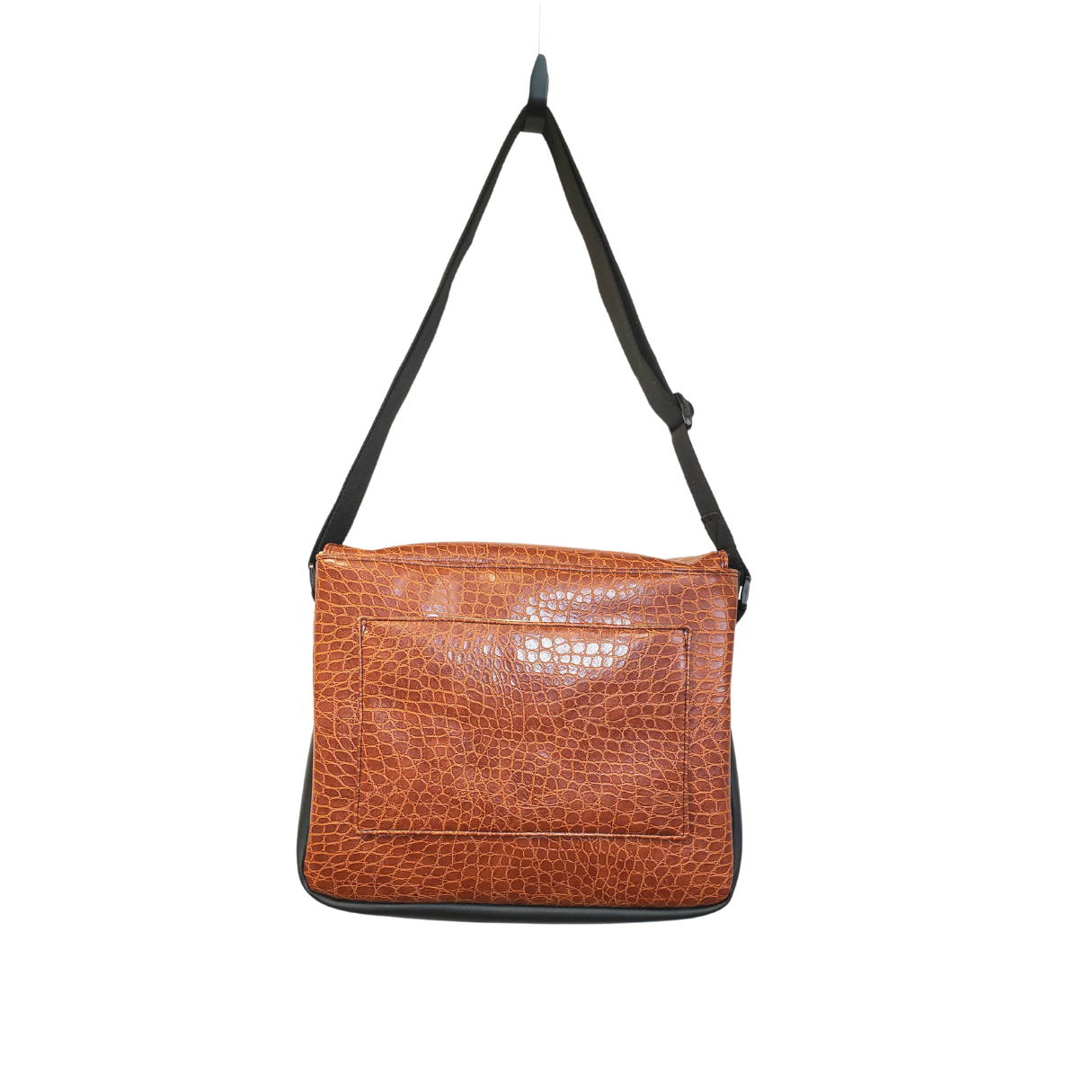 Casual, slightly slouchy messenger style bag from rust colored faux crocodile vinyl and black faux leather. Generous interior with one zipper pocket. Slip pocket on back. Double magnetic snaps on front flap. Adjustable wide crossbody strap.