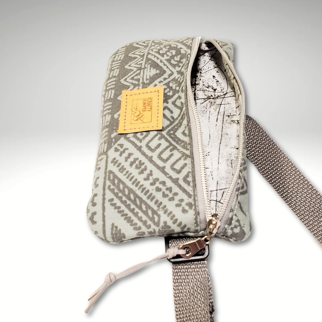 Perfect little bag when you need to be hands free but not without your phone, cash and keys. Can be worn fanny pack style around your waist or diagonally across your chest or back. This little guy will stay snug to your body due to the back sleeve for the belt. Use the included adjustable webbing strap with buckle, or replace with your own narrow belt. Canvas exterior and cotton interior.