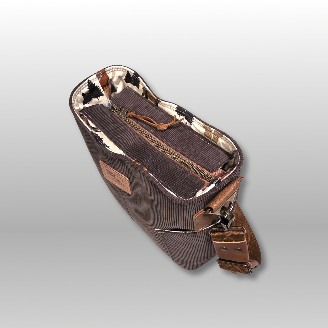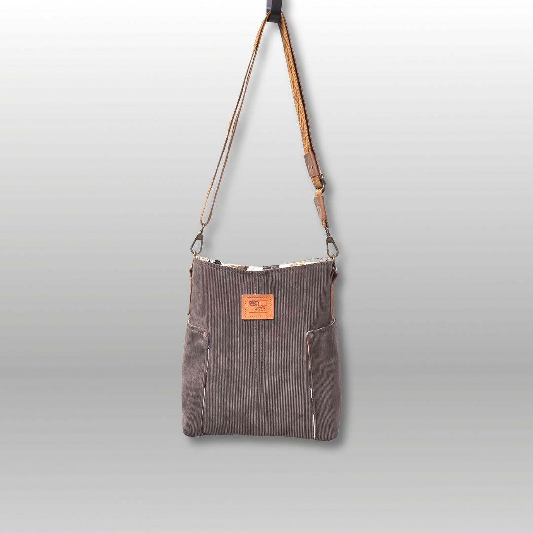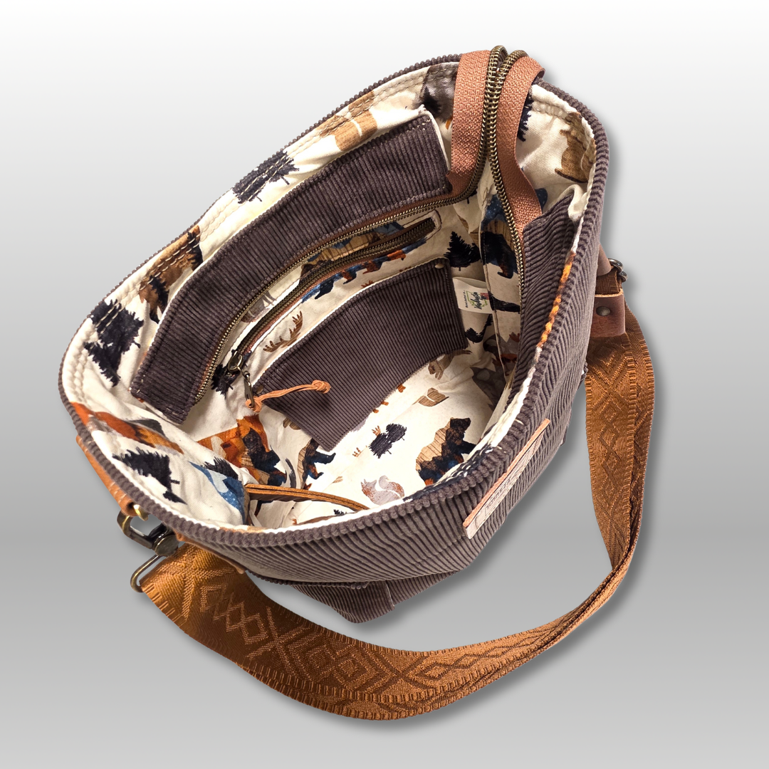 A casual, slightly slouchy bag to sling over your shoulder or wear crossbody with the adjustable webbing strap. Recessed zipper closure, flat bottom. Made from deep brown medium wale corduroy and white northwest motif cotton lining. Two exterior slip pockets. Interior has with one zipper pocket and one slip pocket.