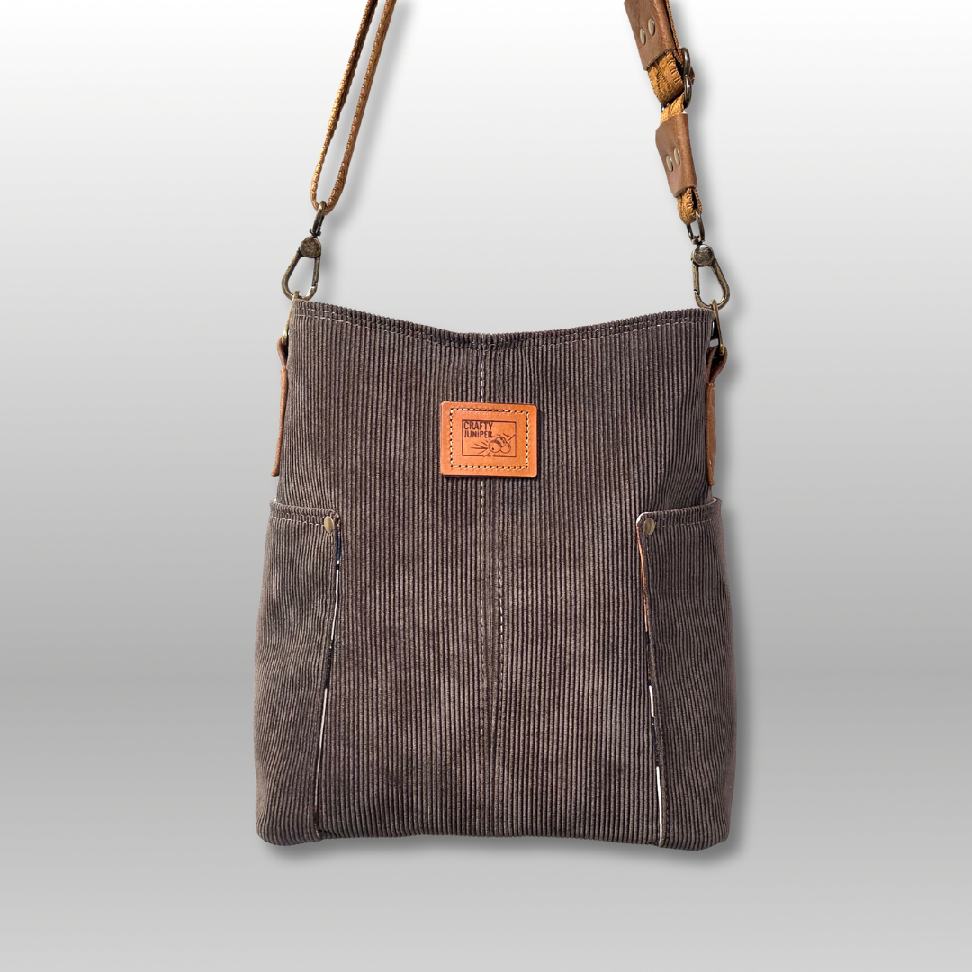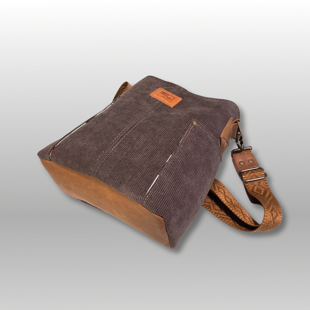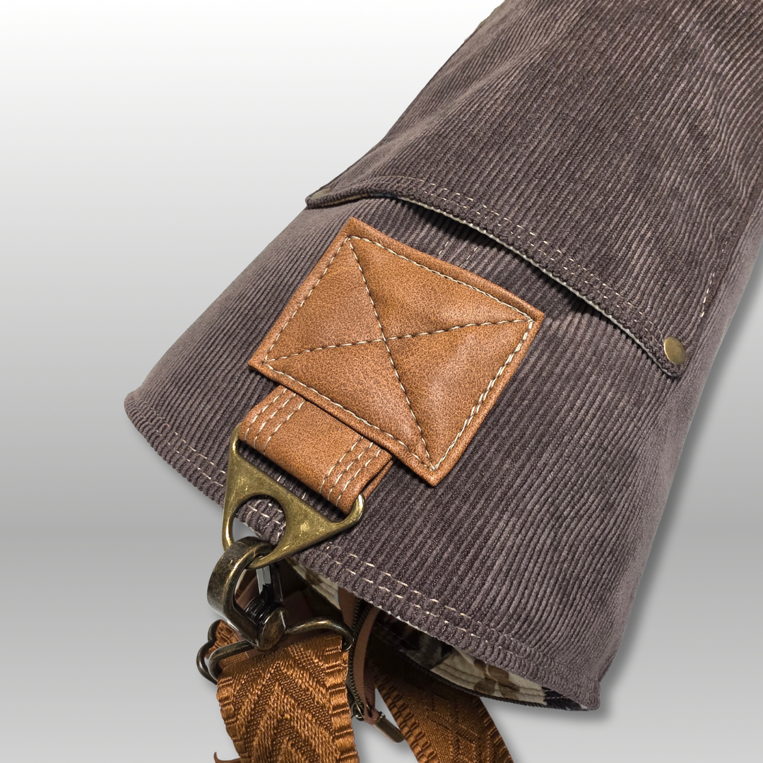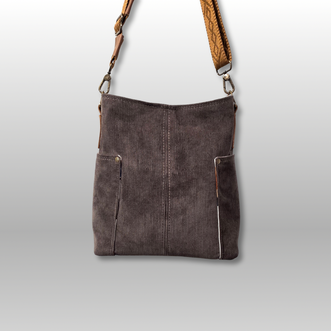 A casual, slightly slouchy bag to sling over your shoulder or wear crossbody with the adjustable webbing strap. Recessed zipper closure, flat bottom. Made from deep brown medium wale corduroy and white northwest motif cotton lining. Two exterior slip pockets. Interior has with one zipper pocket and one slip pocket.