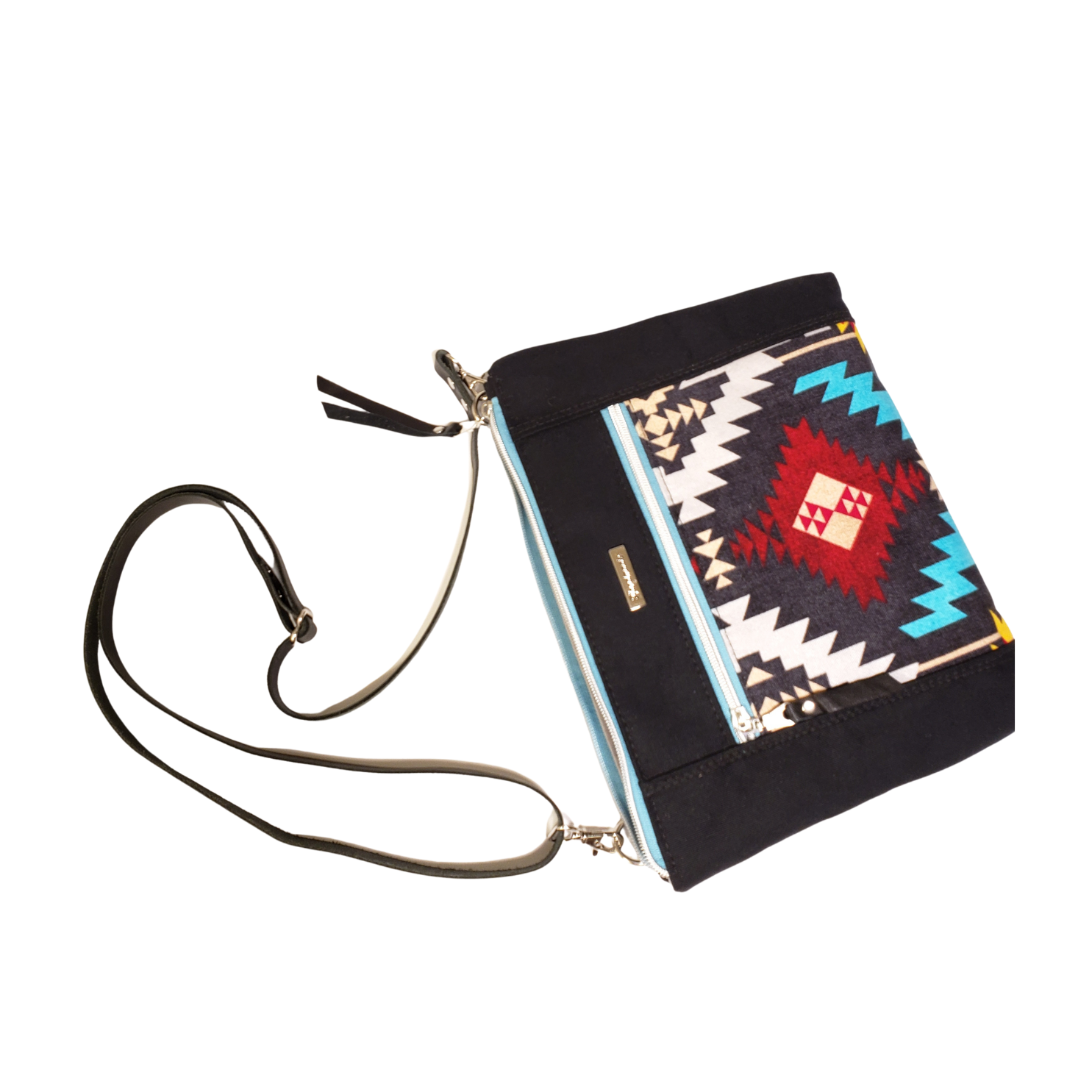 Versatile and compact crossbody bag perfect for travelling. Exterior zipper pocket and dual compartment slip pocket. Generous interior has a leather trimmed slip pocket and attached key fob. Black leather crossbody strap is adjustable to your needs.