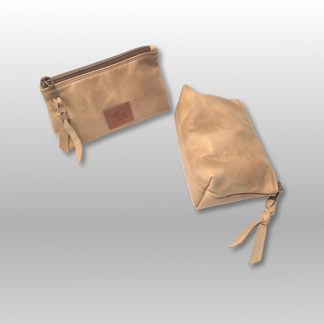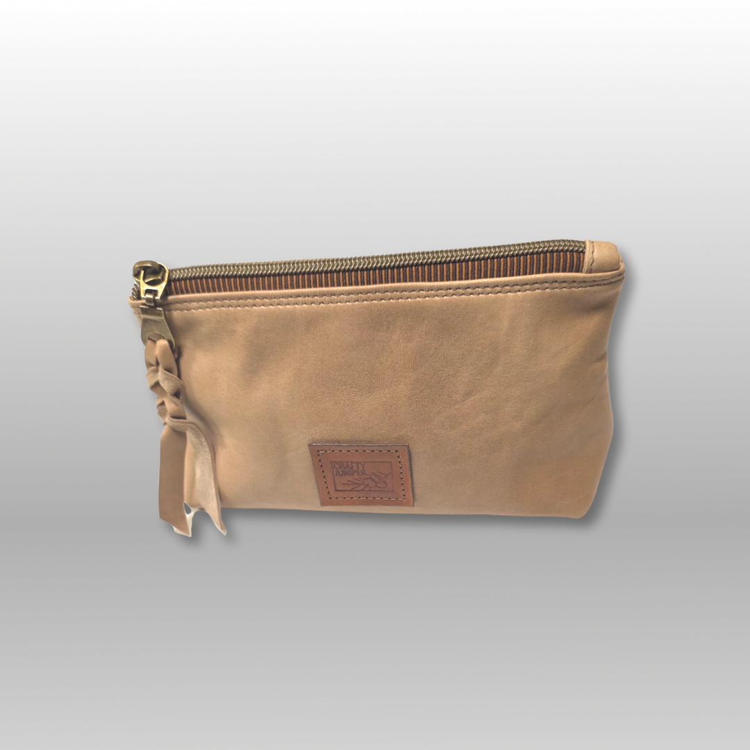 Supple buckskin colored leather zipper pouch for cosmetics, jewelry or any other small assortment of treasures you need contained. This unlined pouch may outlive the goods inside it.
