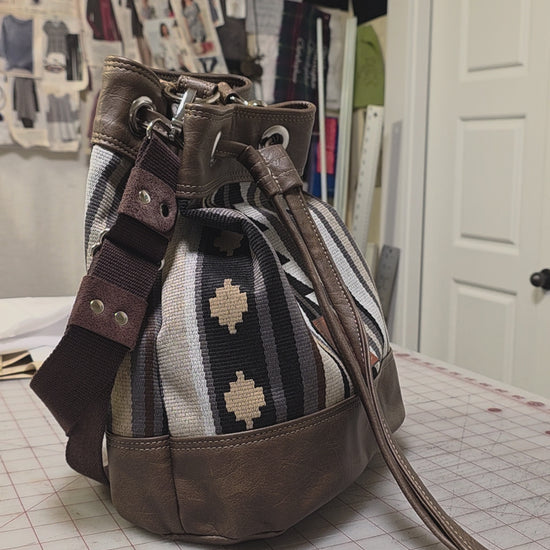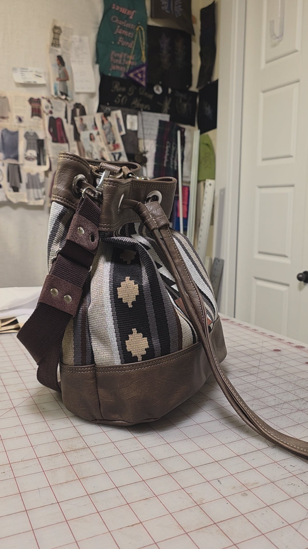 Efficiently store and retrieve your belongings with the Drawstring Bonnie Bucket bag. Featuring a stylish striped southwest fabric with vinyl accents and a waterproof canvas interior, this bag is not only functional but also fashionable. Keep your essentials secure with the one zipper pocket and convenient key tether. The 1.5" wide webbing adjustable cross body straps provide versatility for carry options.
