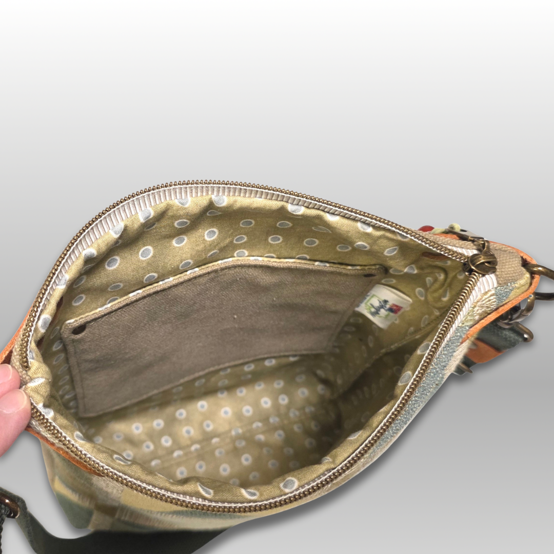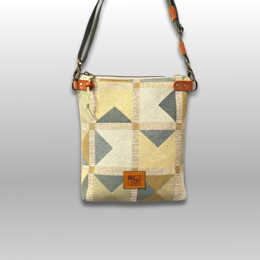 The Easy Crossbody Bag is a simple, vertically oriented basic design. Perfect when you want to change bags to match your outfit. Upholstery fabric with cotton lining. Plenty of room for a tablet, phone, wallet, keys and more. Exterior and interior slip pocket, top zipper closure and 1" adjustable webbing strap with metal hardware.