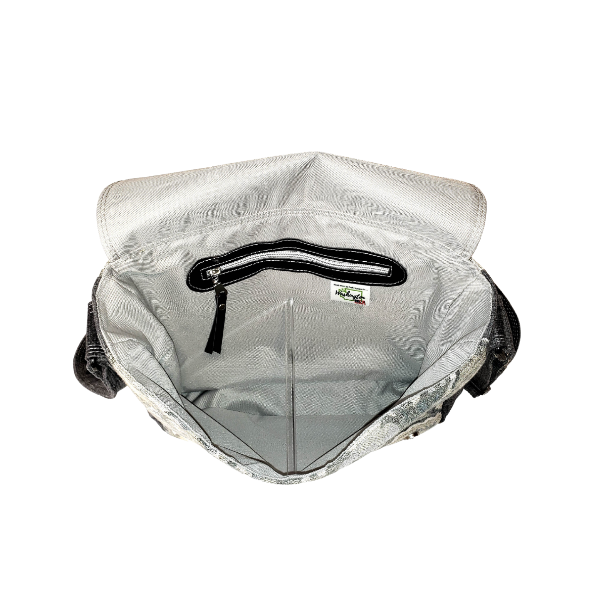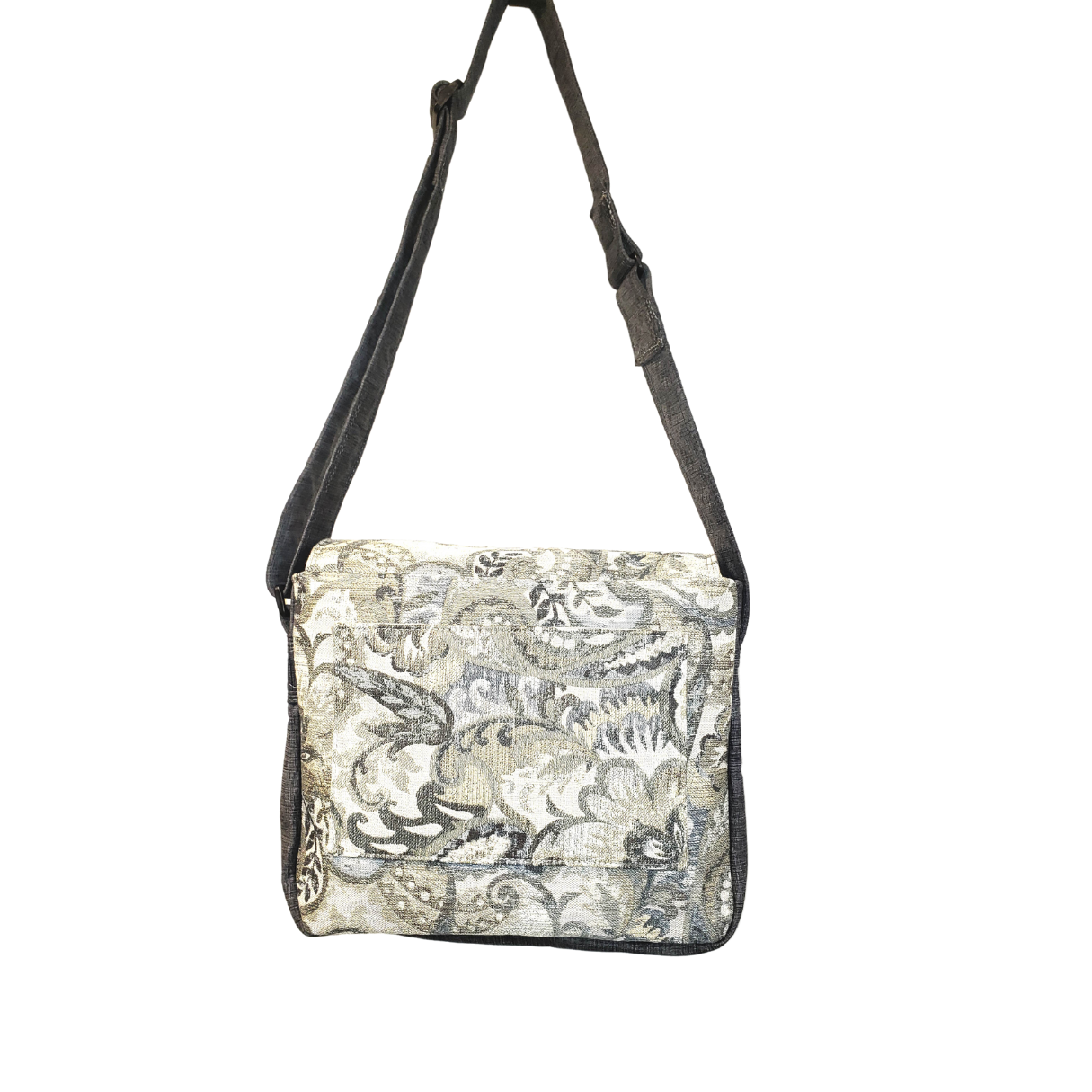 Casual, slightly slouchy messenger style bag from floral home decor fabric and charcoal colored plush fabric. Generous interior with one zipper pocket. Slip pocket on back. Double magnetic snaps on front flap. Adjustable wide crossbody strap.