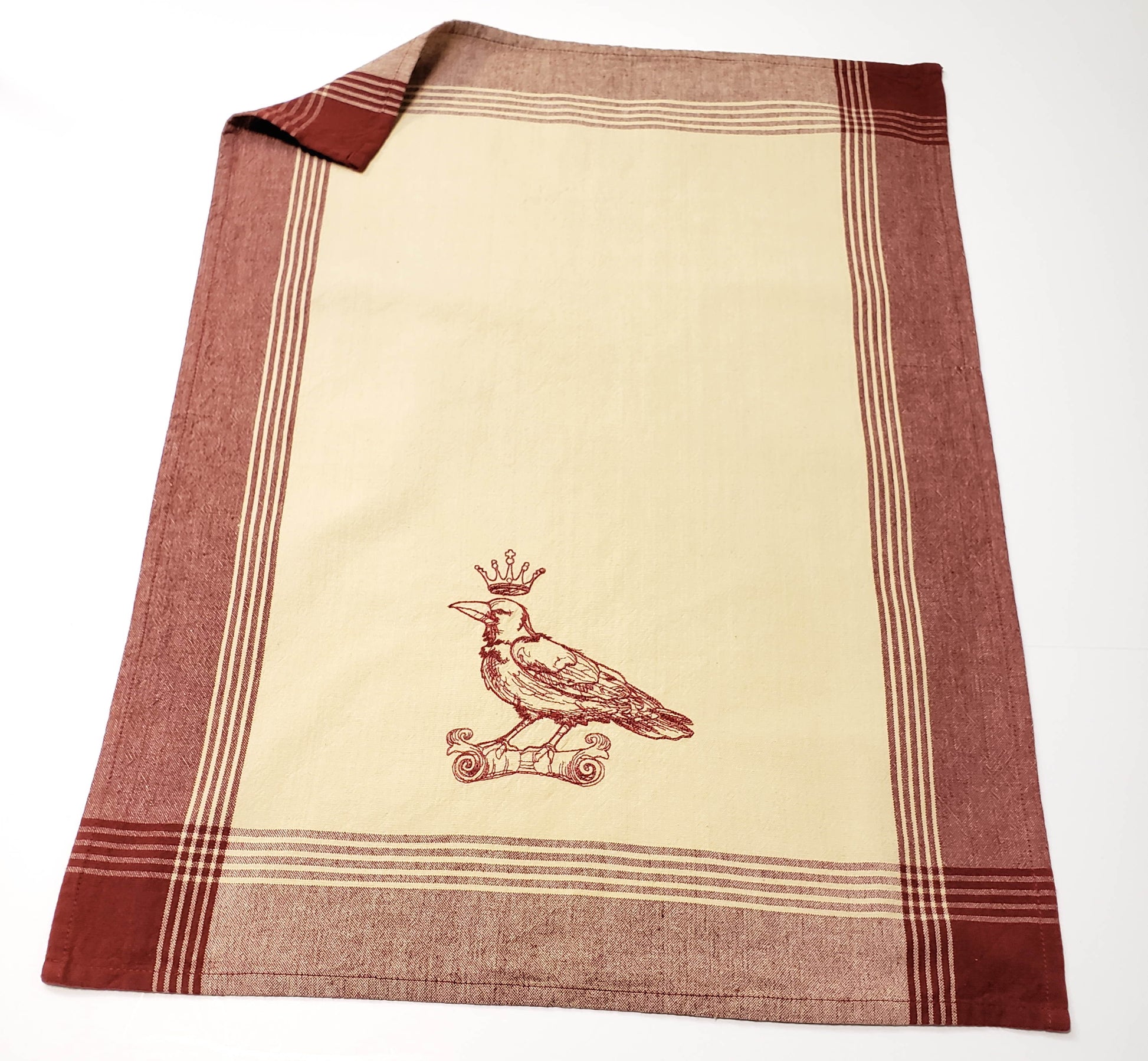 Quality Dunroven brand red and cream linen towel embroidered with regal raven motif. 1 color.