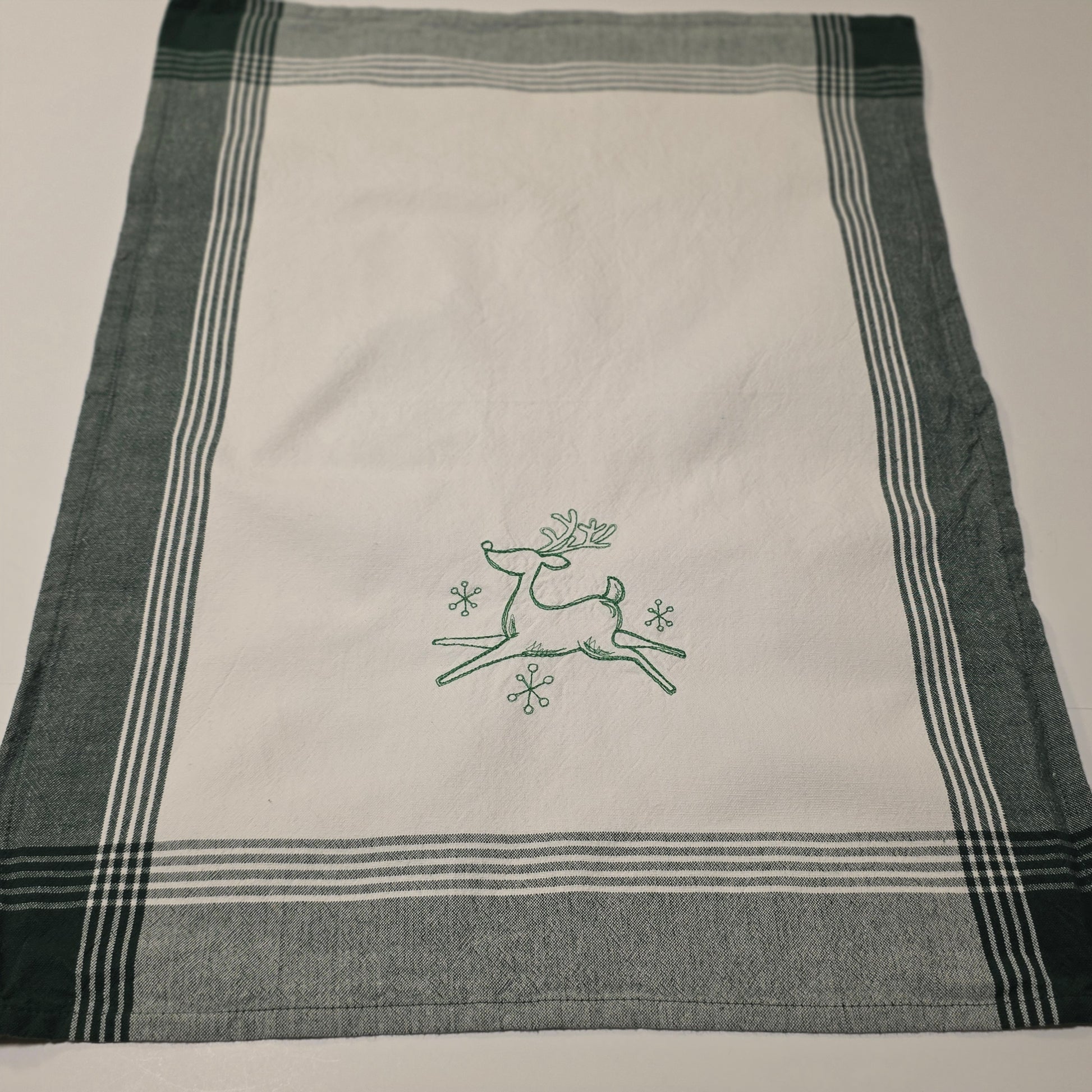 Top quality Dunroven dark green and white cotton towel embroidered with vintage reindeer in green. 1 color.