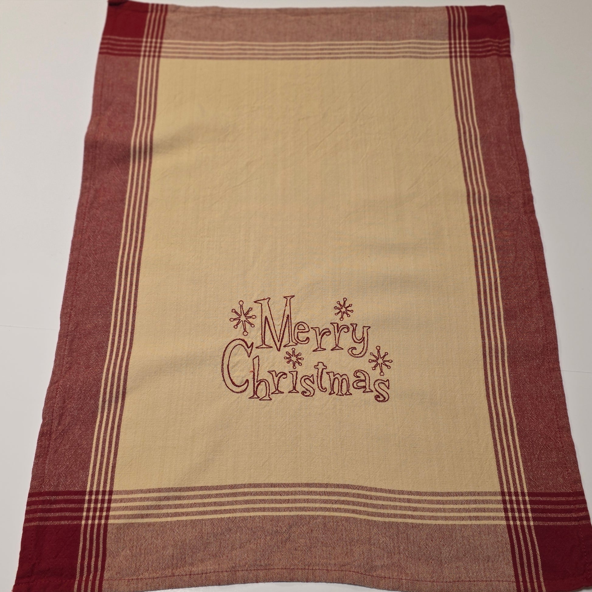 Top quality Dunroven red and cream cotton towel embroidered with vintage Merry Christmans motif in dark red. 1 color.