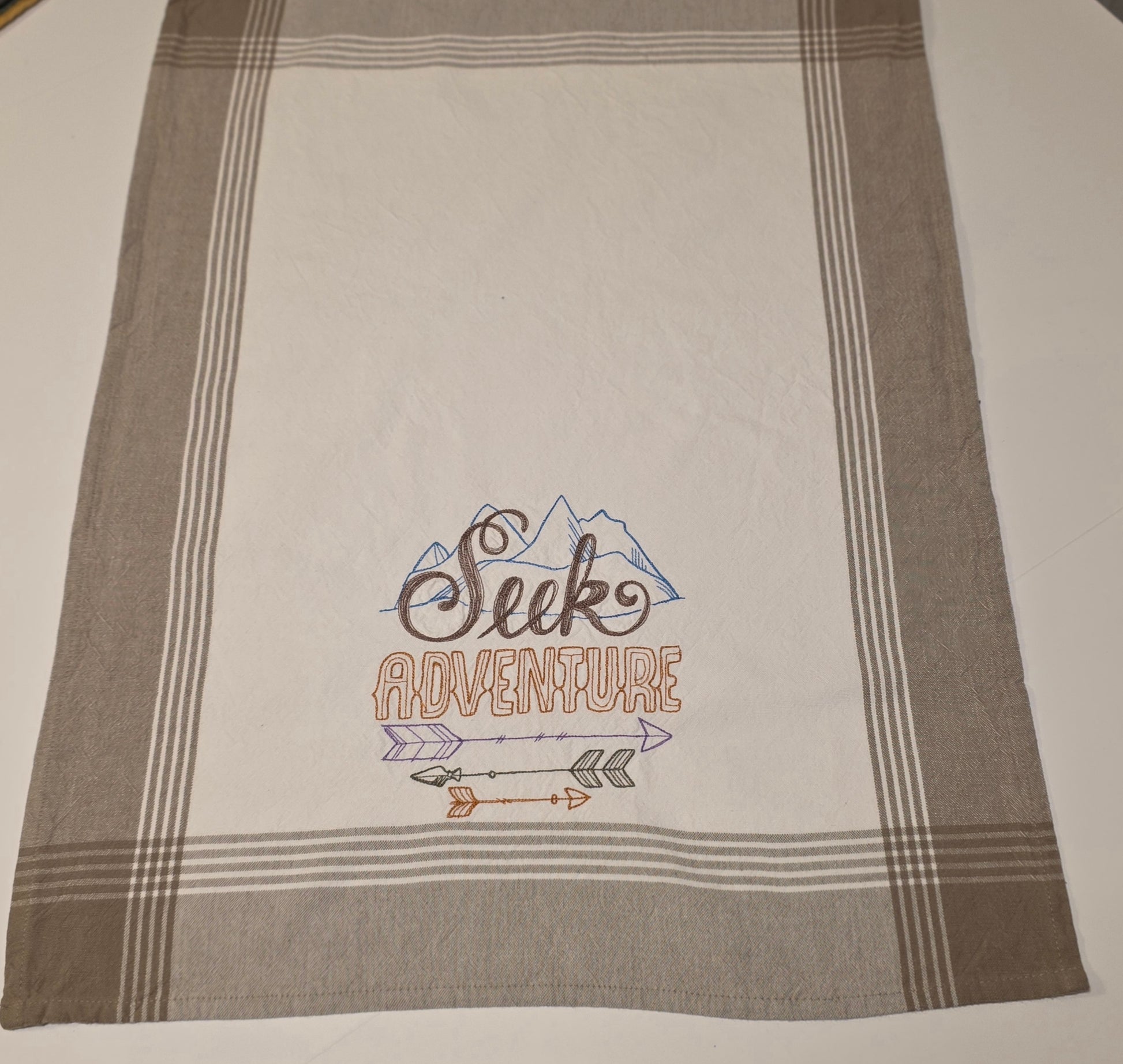 Top quality Dunroven taupe and white cotton towel embroidered with Seek Adventure in brown, blue and rust. 4 colors.
