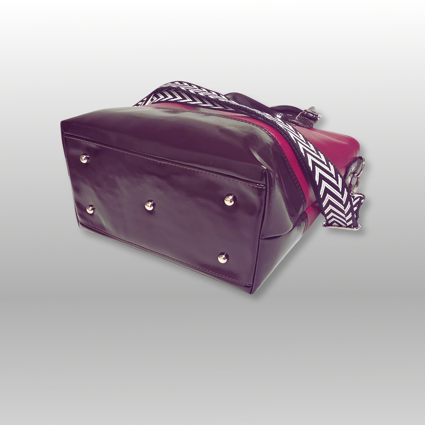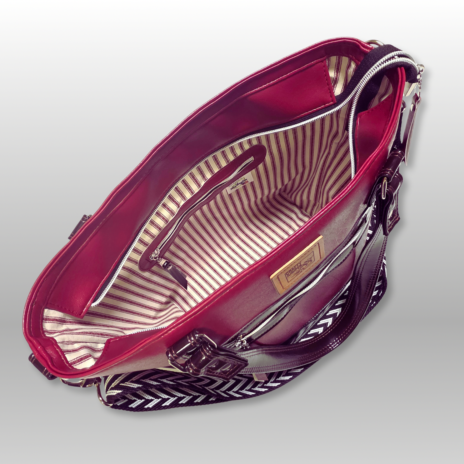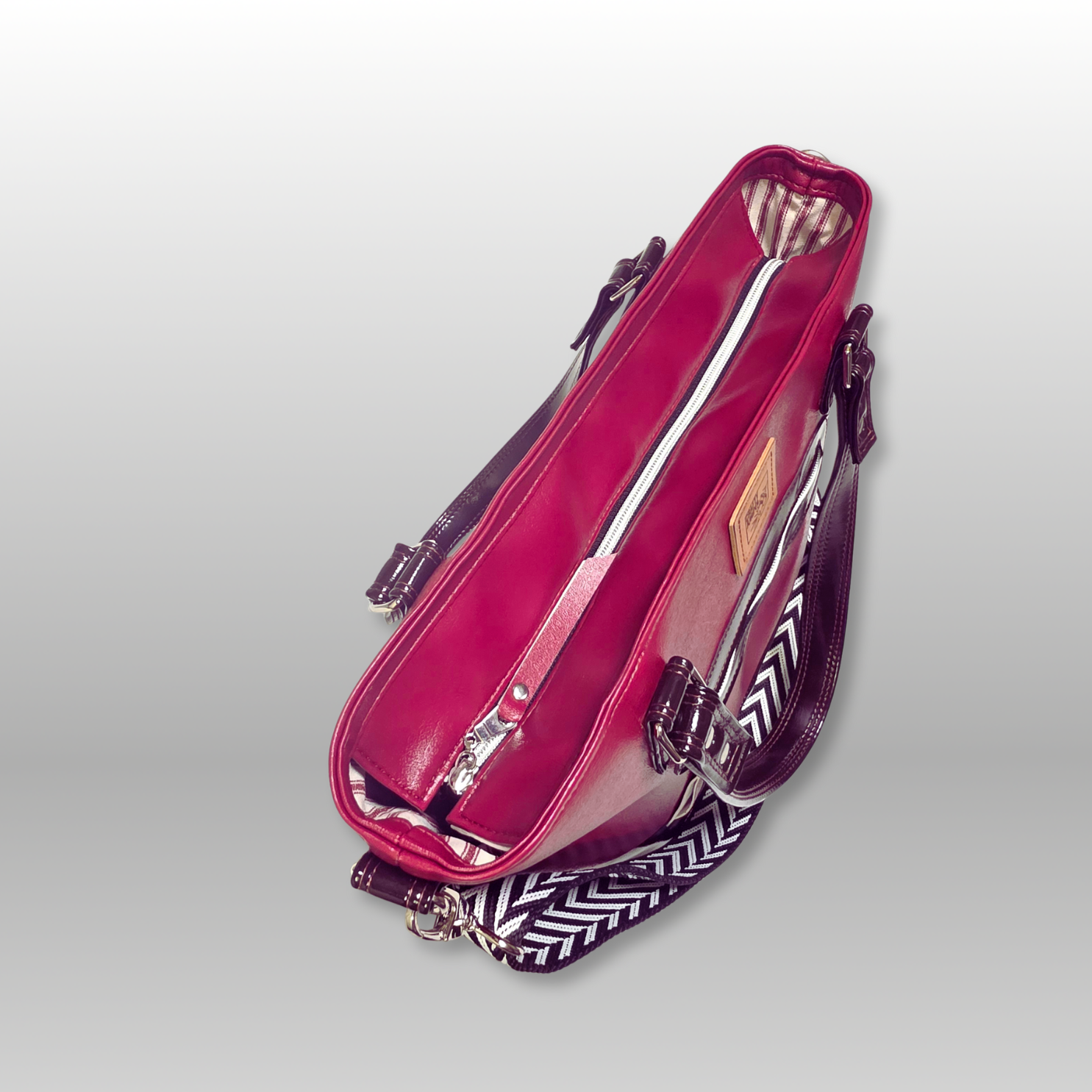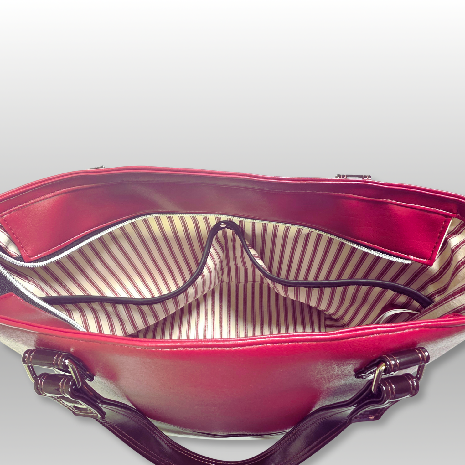 Meet the Emily Tote—the bag that adapts to your lifestyle. Whether you need it as a shoulder carry or crossbody style, this spacious companion keeps up with your demands. The striking cherry red and black faux leather exterior pairs beautifully with a charming red and white ticking cotton interior, making every reach inside a pleasure. Packed with smart storage—external zipper pocket, internal zipper pocket, and a divided slip pocket—it holds your laptop, tablet, essentials, and lunch without breaking a sweat. The secure recessed zipper and removable, adjustable 1.5" strap give you the flexibility and peace of mind you deserve. Invest in a tote that works as hard as you do. Bottom bag feet to keep the base off of dirty floors. Option to switch black and white webbing strap with solid black.