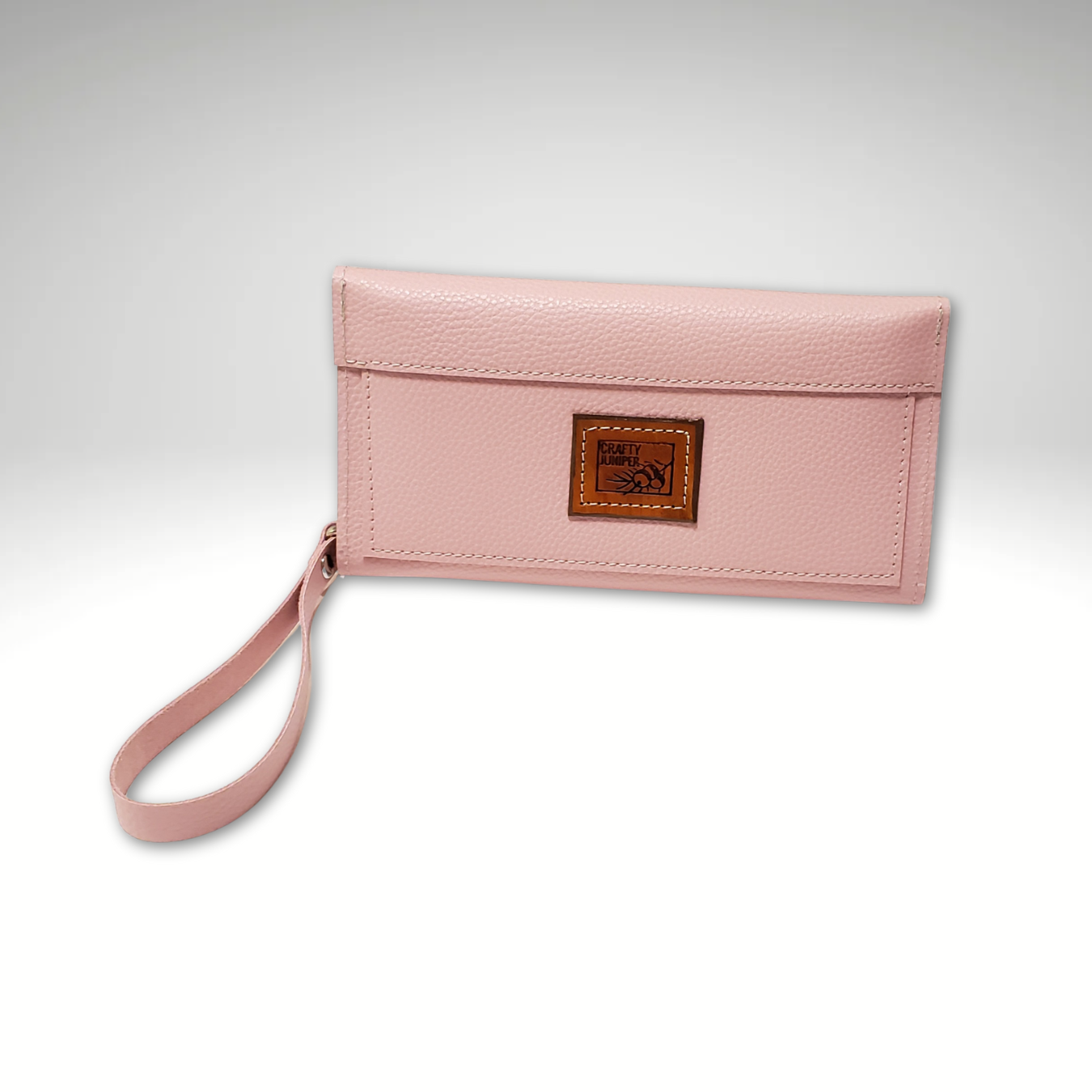 This clutch style wallet is versatile, changing from a clutch to a wristlet by detaching the strap, or tuck the strap inside to keep it out of the way. Two card slots inside, plus 2 zipper pockets and a bill pocket in the back. Magnetic snaps keep the pockets attached together and also closes the top flap. Body is a semi firm pebble grain light pink color, with gray zippers.