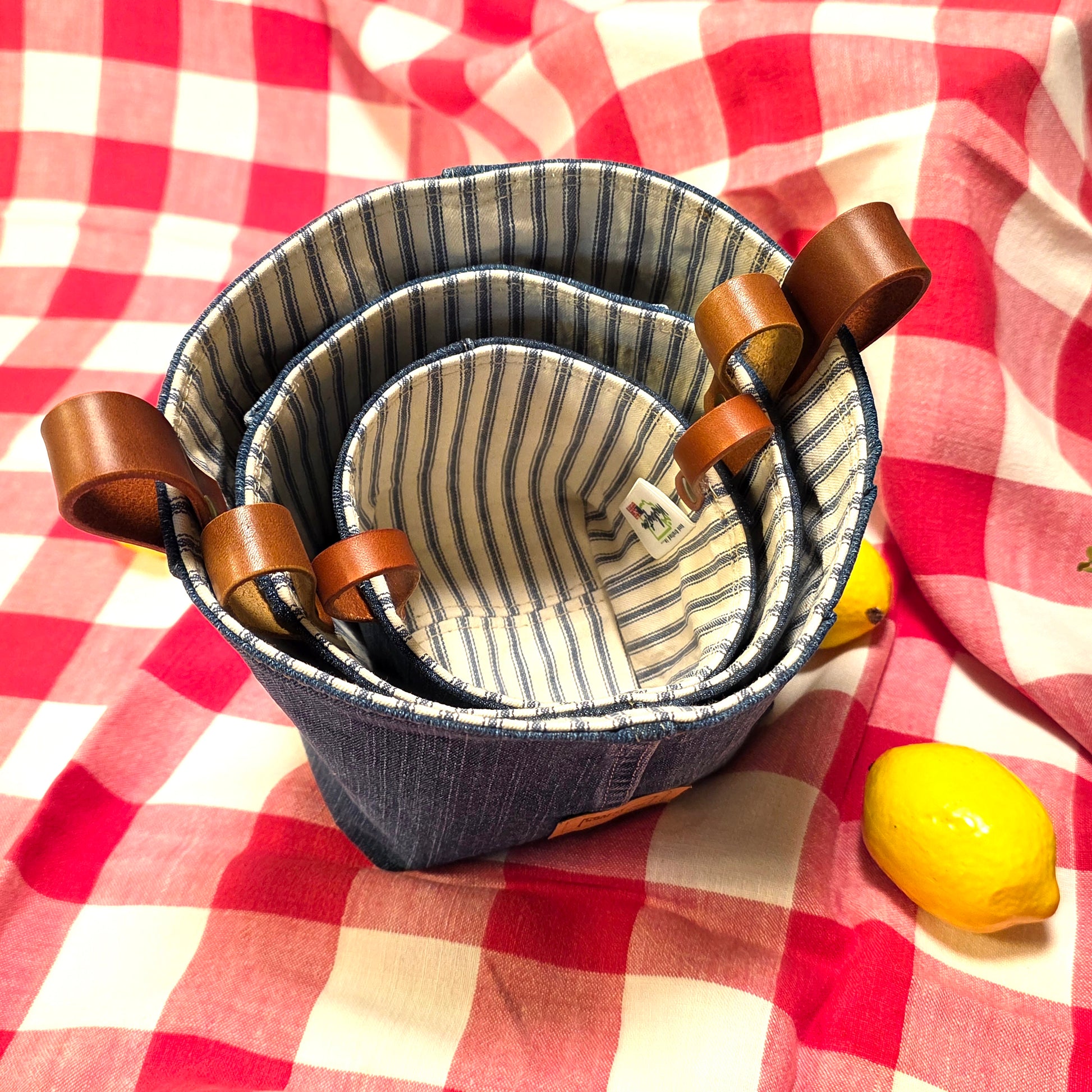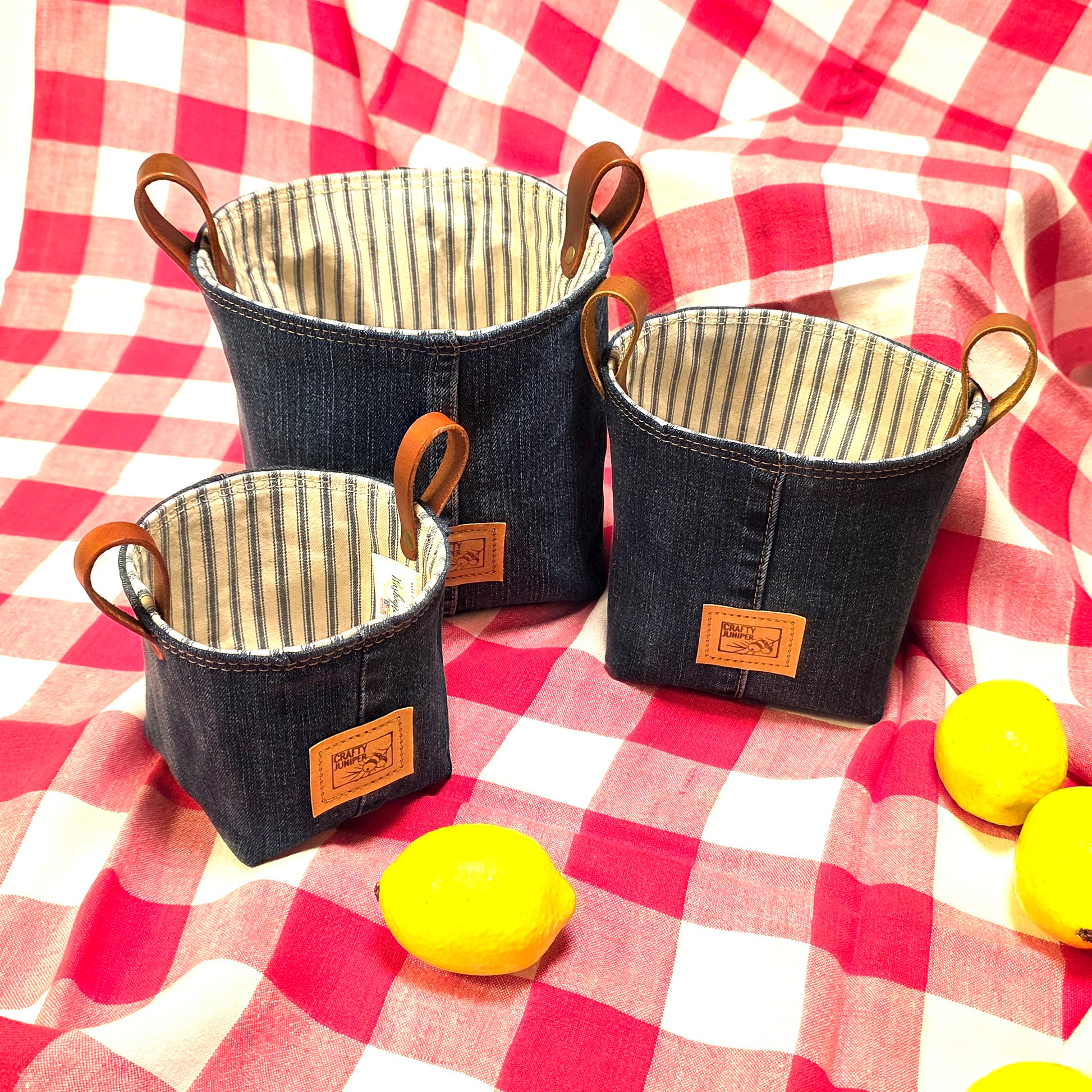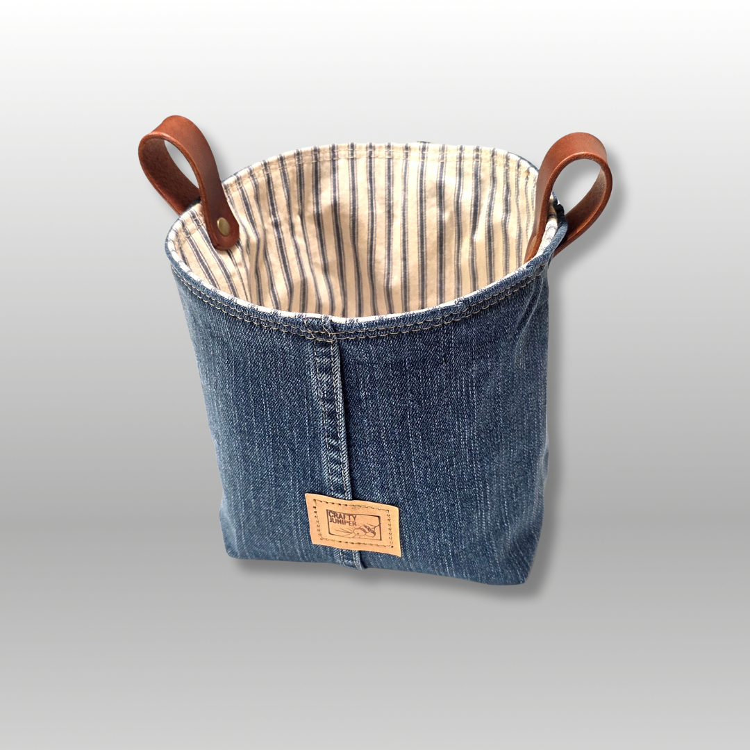 Large size reversible fabric container with square-ish bottom and round-ish top. Upcycled denim exterior and retro cotton ticking lining. Dual leather handles. A stylish container for potted plants, bathroom essentials, baby products or cosmetics. Great as a container for your shower gift items.