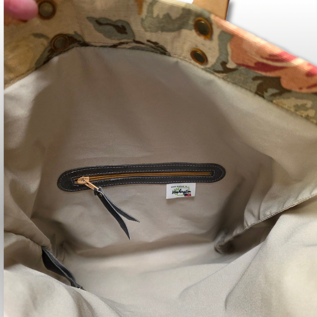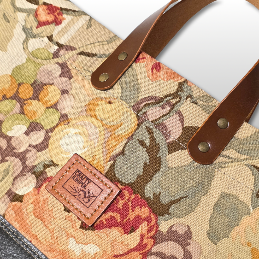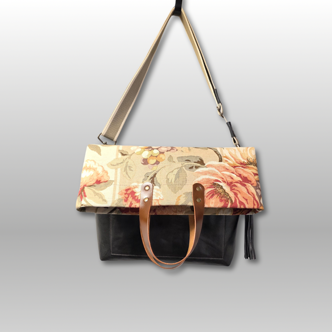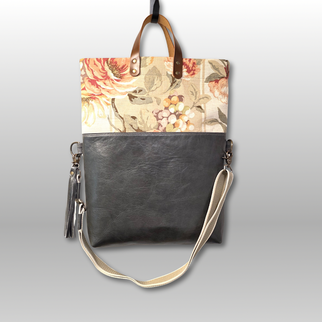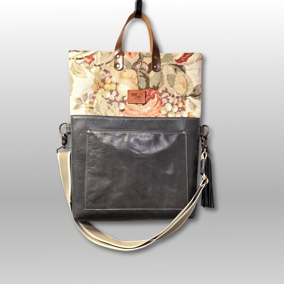 A luxuriously large tote bag, bottom is an dark grayish olive aniline leather, top is a vintage look floral canvas. Lower exterior has a deep slip pocket, interior has a generous overlay zipper pocket in buff colored water resistant canvas. Beveled leather handles and 1 1/2" wide adjustable crossbody webbing strap. Can be carried folded on shoulder or crossbody, or extended by the top handles. Plenty roomy for all your daily carrying needs.