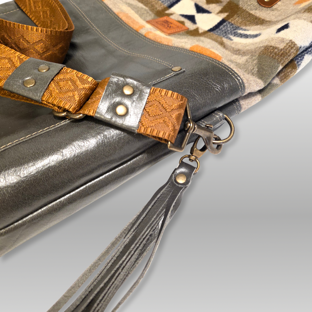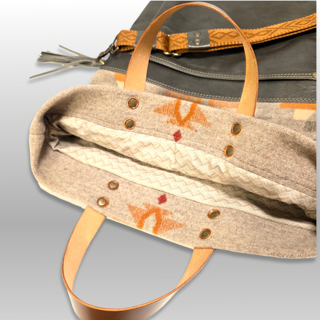 A luxuriously large tote bag, bottom is an dark grayish olive aniline leather, top is Pendleton® wool, Juniper Mesa. Lower exterior has a deep slip pocket, interior has a generous overlay zipper pocket. Beveled leather handles and 1 1/2" wide adjustable crossbody webbing strap. Can be carried folded on shoulder or crossbody, or extended by the top handles. Plenty roomy for all your daily carrying needs.
