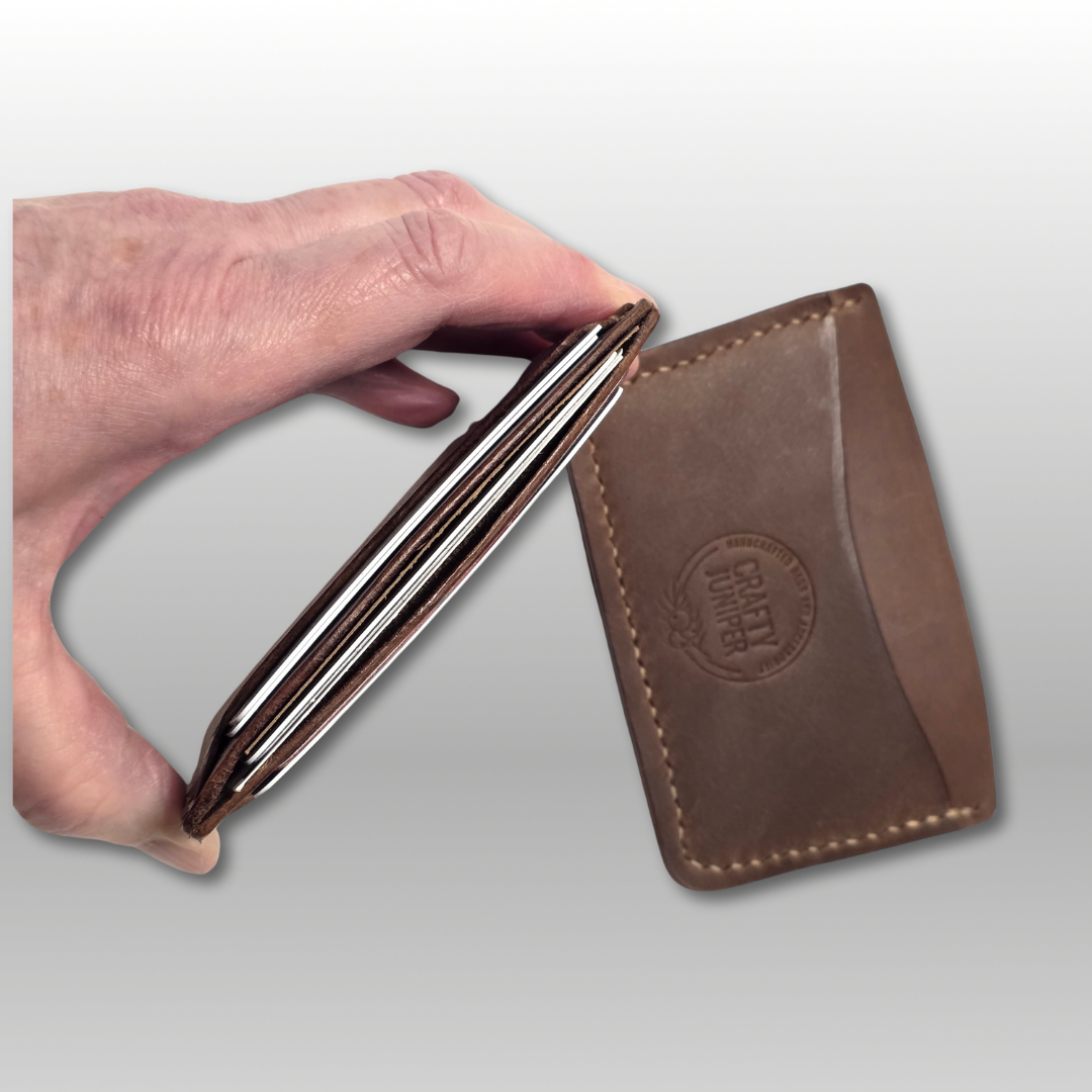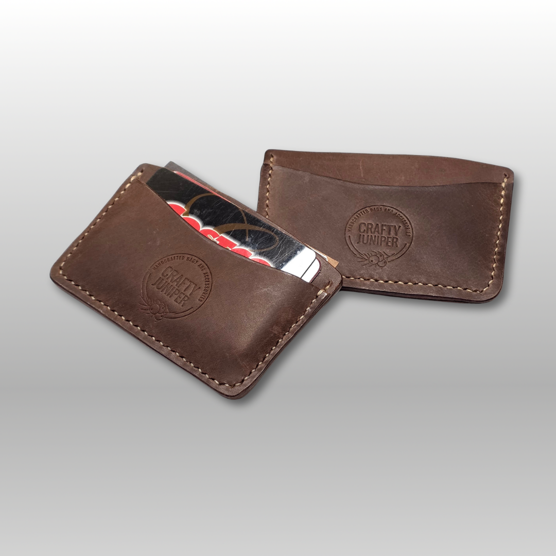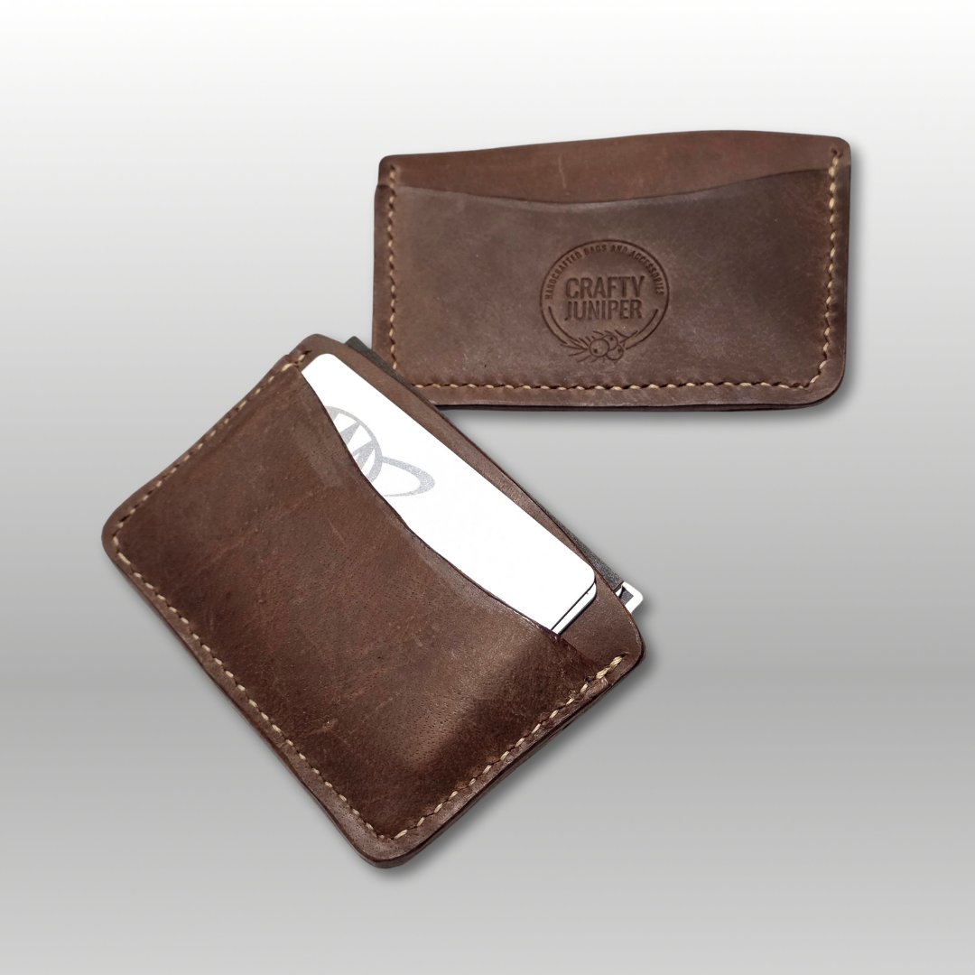 Keep all your critical cards in one place with this 3 pocket leather card wallet. Hand stitched and edge burnished, this card case will not snag going in and out of your pocket or bag. Will fit 6-8 plastic cards and will soften and expand with use.