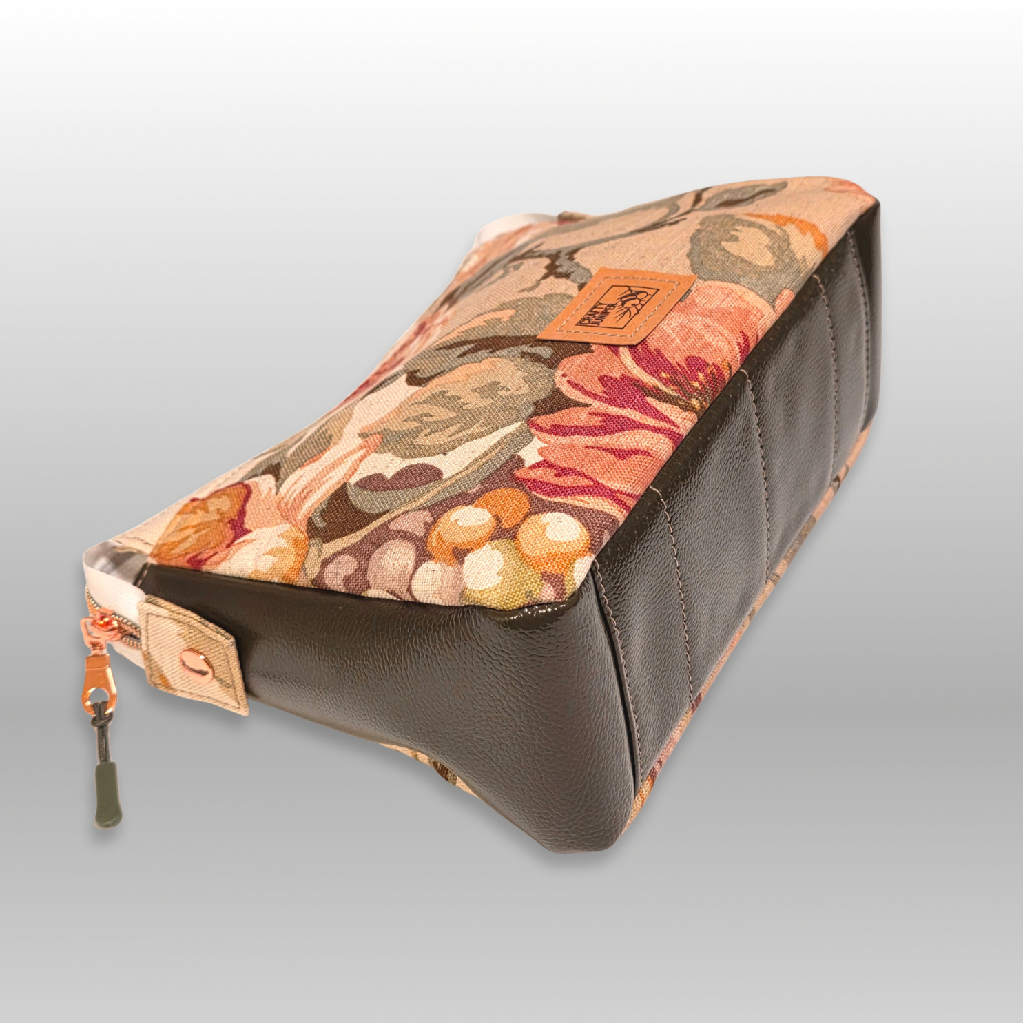 The Plover is a fun zipper pouch for cosmetics, toiletries or crafting supplies. Flat bottom, top zipper and 2 interior pockets, one with zipper and a divided mesh slip pocket. Exterior is a home dec floral pattern and interior is a green cotton. Top zipper snaps can be undone for wider access.