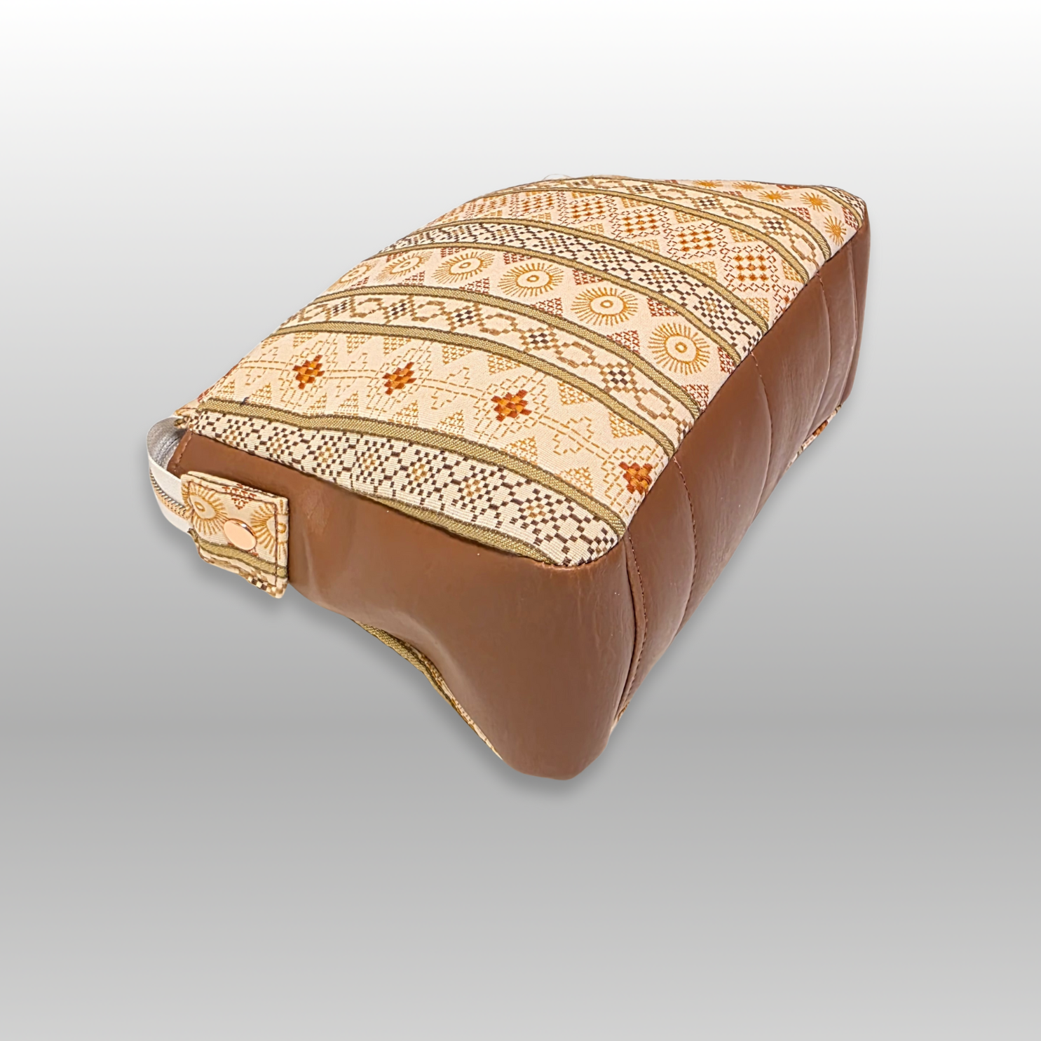 The Plover is a fun zipper pouch for cosmetics, toiletries or crafting supplies. Flat bottom, top zipper and 2 interior pockets, one with zipper and a divided mesh slip pocket. Exterior is a home dec embroidery motif and interior is a khaki waterproof canvas. Top zipper snaps can be undone for wider access.