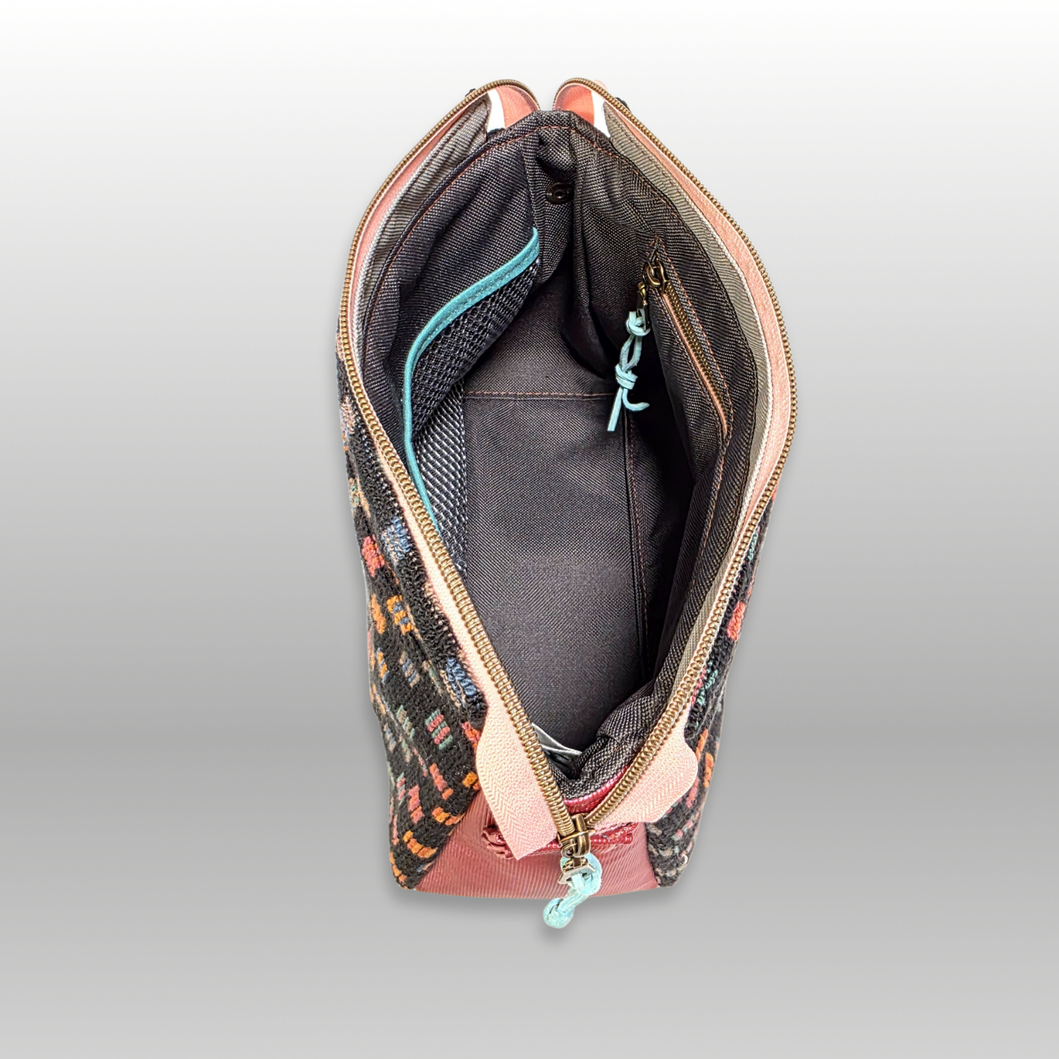 The Plover is a fun zipper pouch for cosmetics, toiletries or crafting supplies. Flat bottom, top zipper and 2 interior pockets, one with zipper and a divided mesh slip pocket. Exterior is a home dec chenille and interior is a gray waterproof canvas. Top zipper snaps can be undone for wider access.