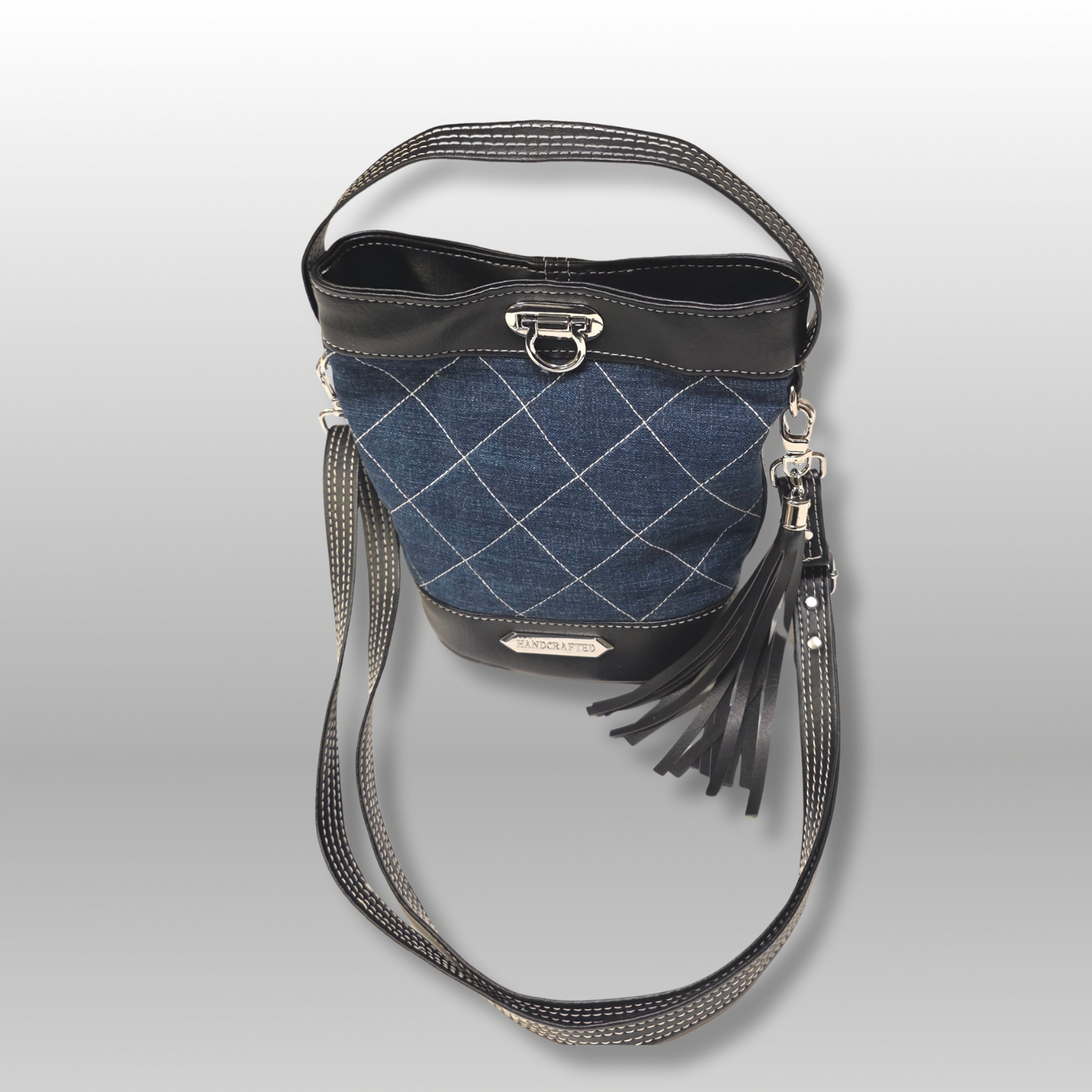 Sabrina is a charming and chic mini faux leather quilted denim bucket bag with contrasting accents, sturdy handle, removable crossbody strap and a flip lock closure. Interior is a cotton. This design was inspired by the effortless elegance captured by Audrey Hepburn in the movie Sabrina.