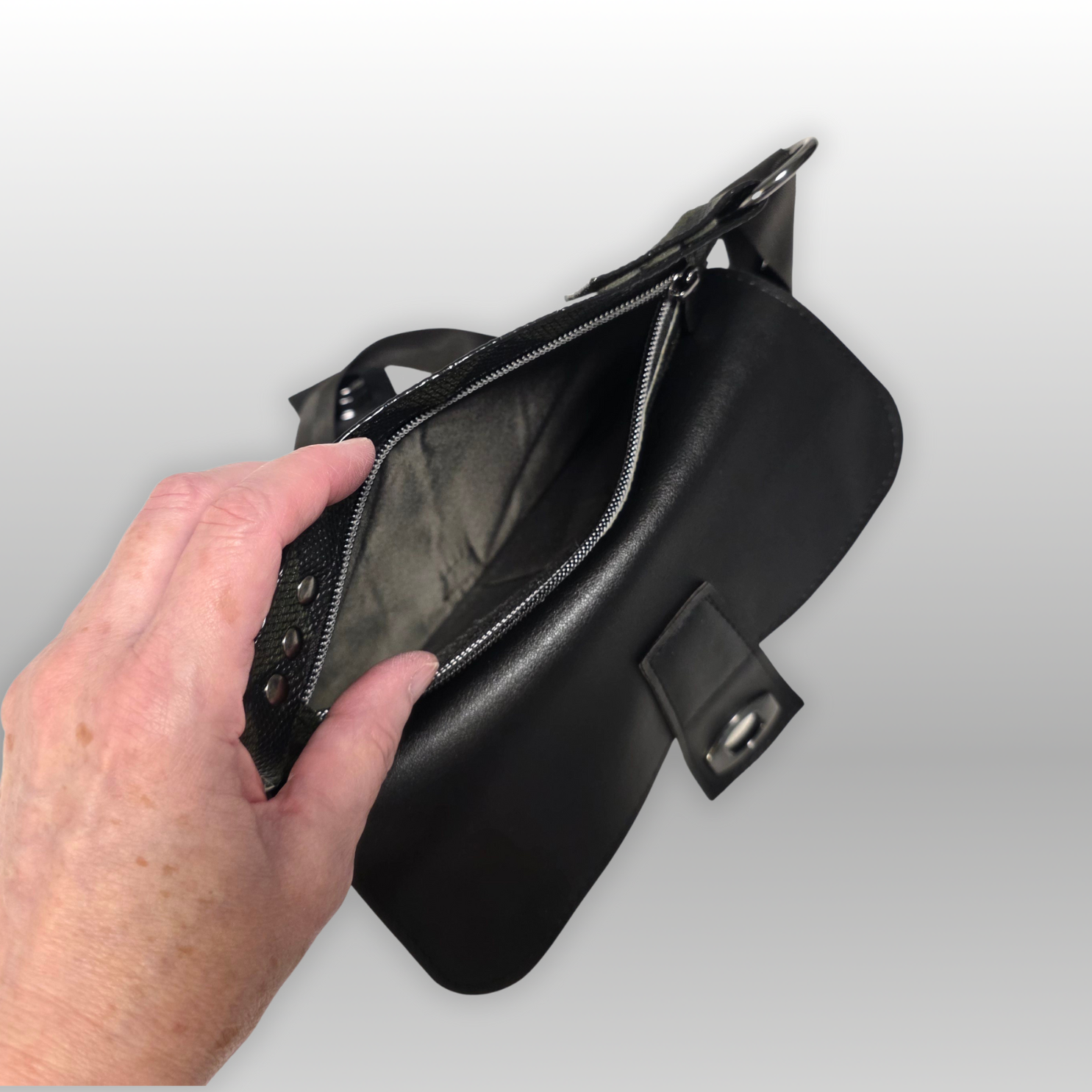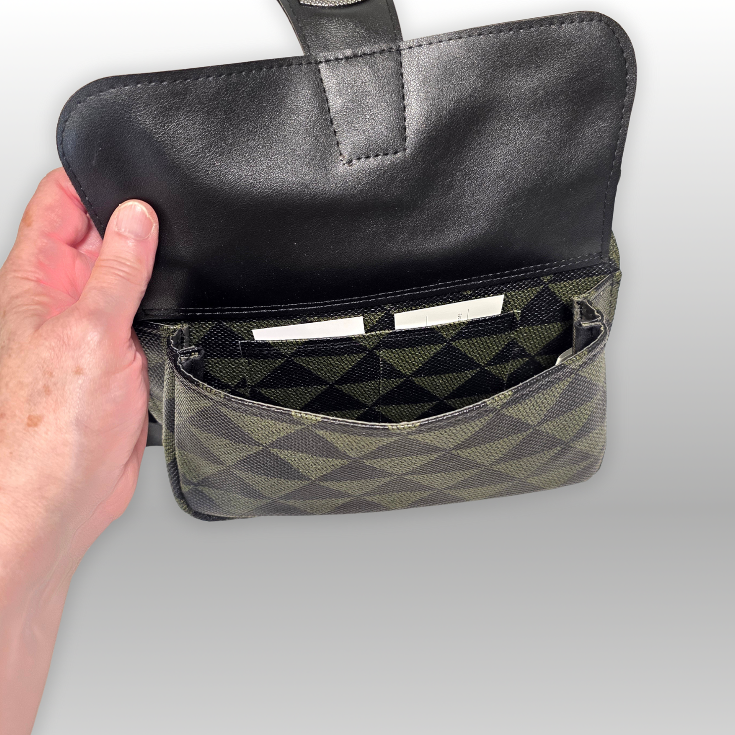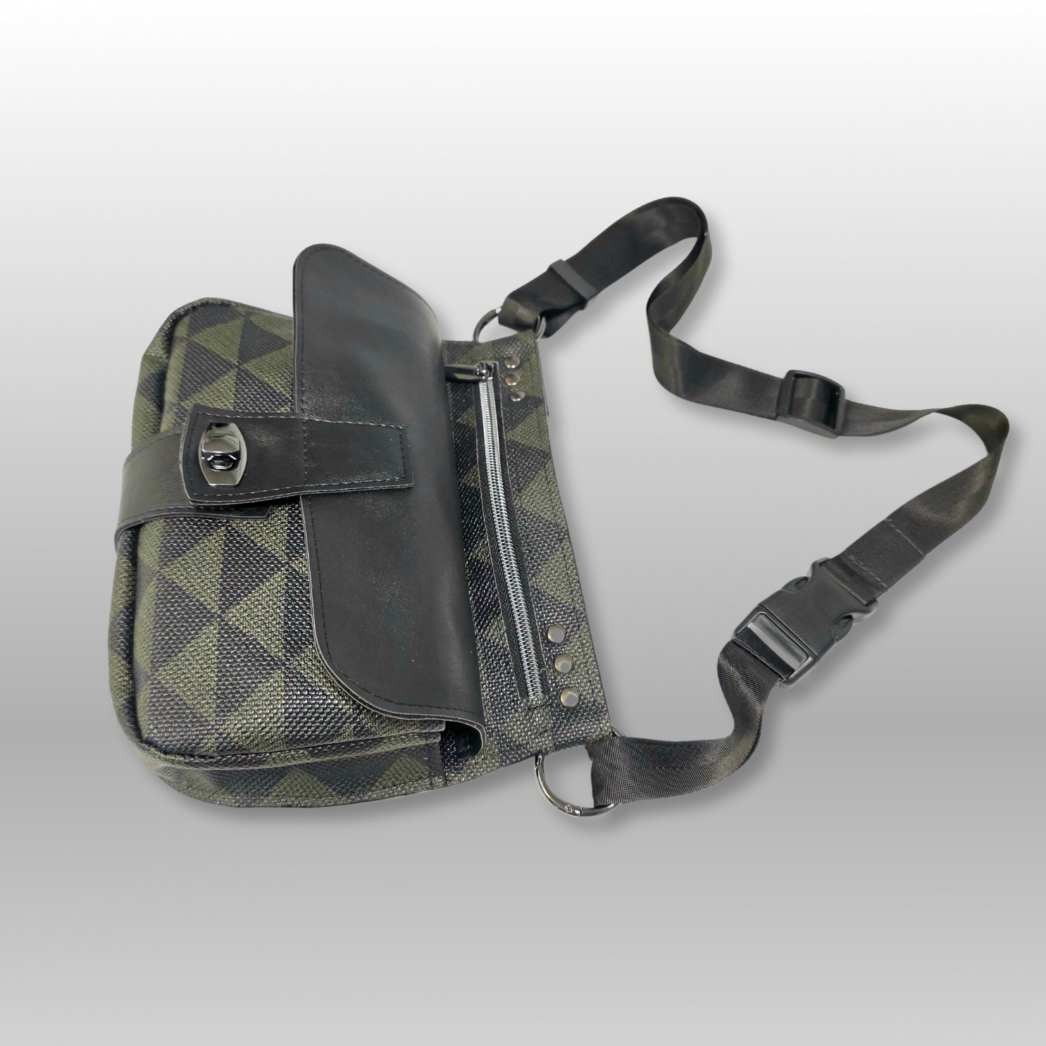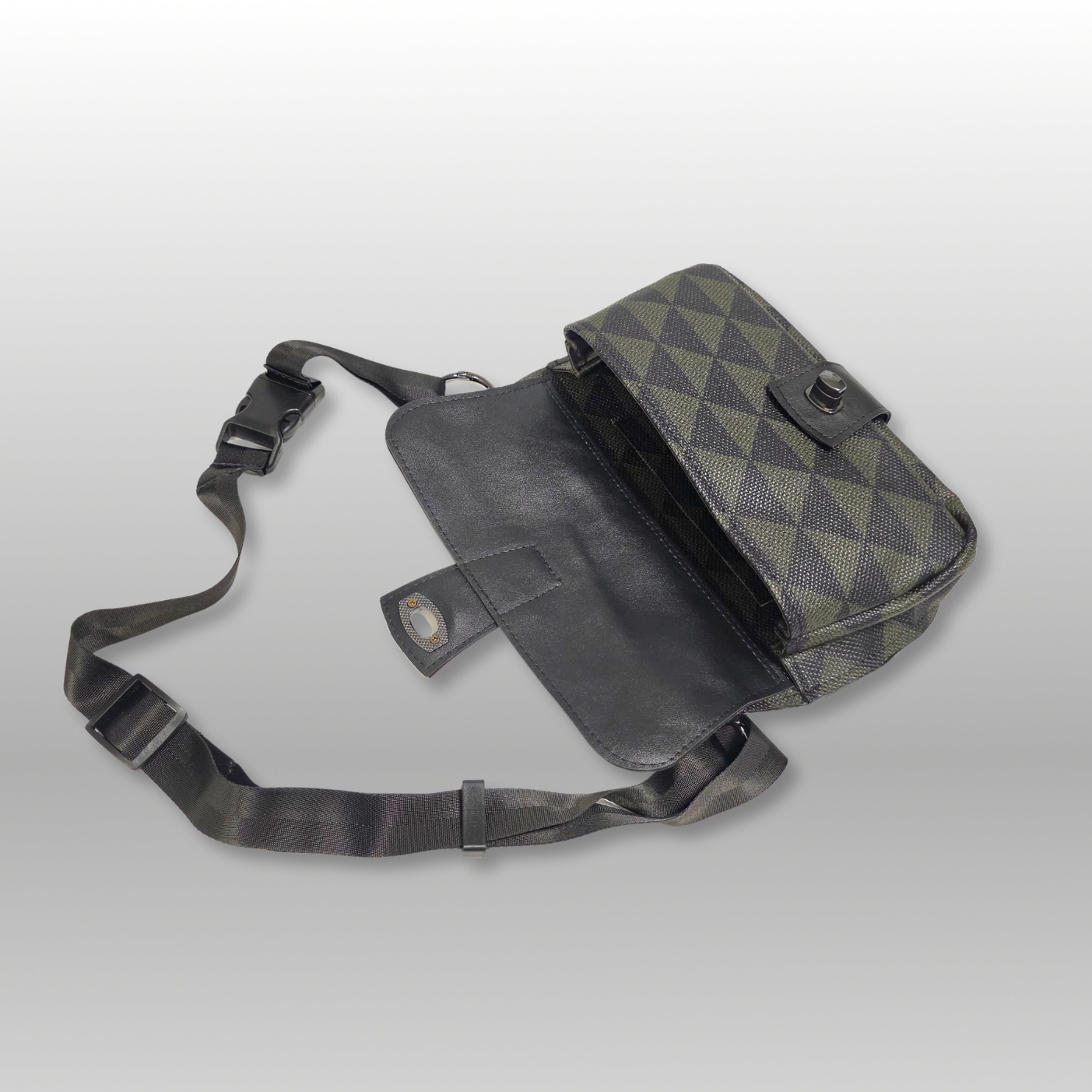 The Sorella Hip Bag offers a refined take on the classic hip bag, also known as a fanny pack or waist bag. Designed to be worn around the hip or across the body, it combines style and function effortlessly. Crafted from green and black diamond-patterned faux leather with solid black accents, it’s compact yet spacious enough to hold your phone and essentials. Inside, green satin lining reveals two card slots, and behind that a secure zippered pocket for valuables, making it an ideal accessory for both everyday use and travel. The seat belt webbing adjustable strap has a quick release buckle for easy on and off.