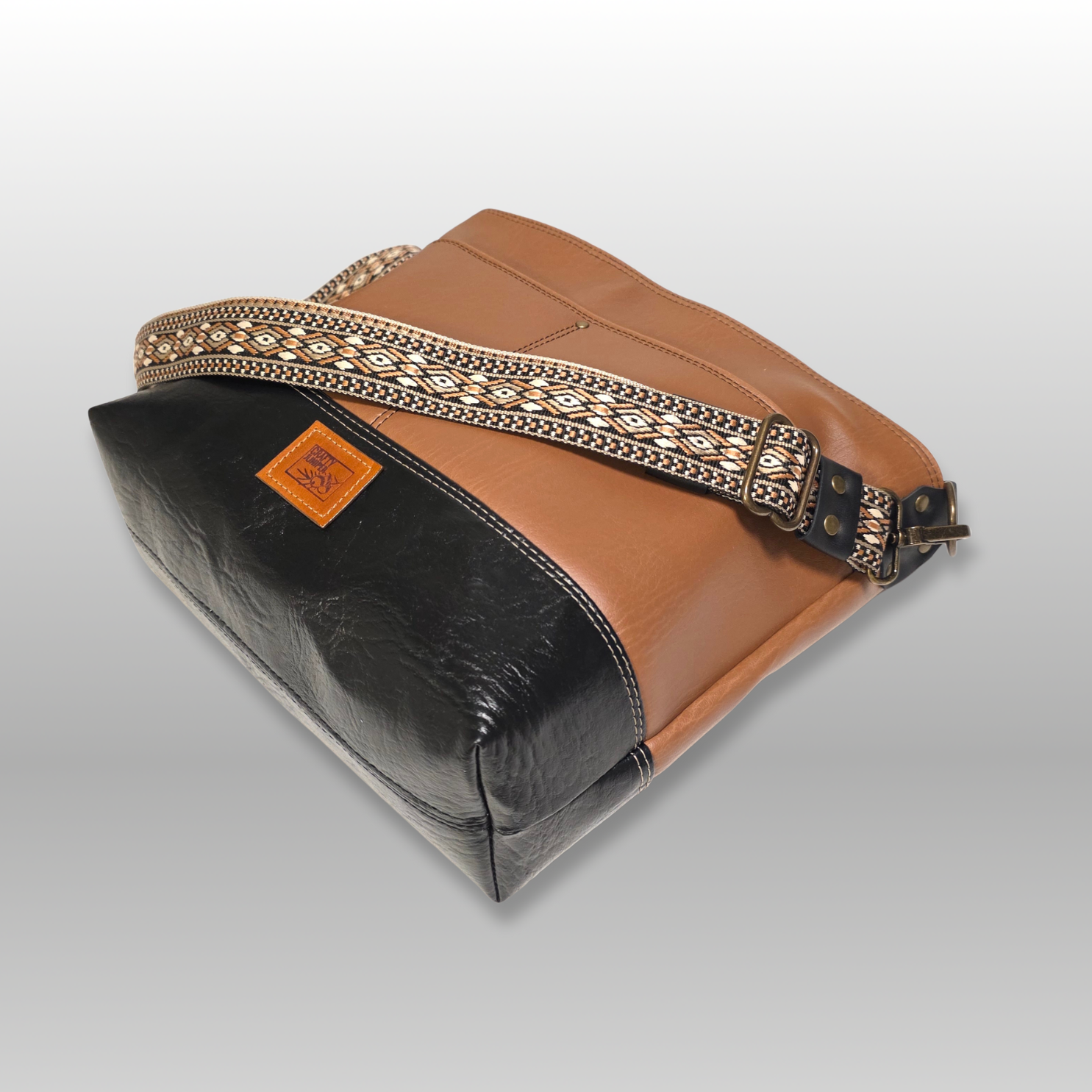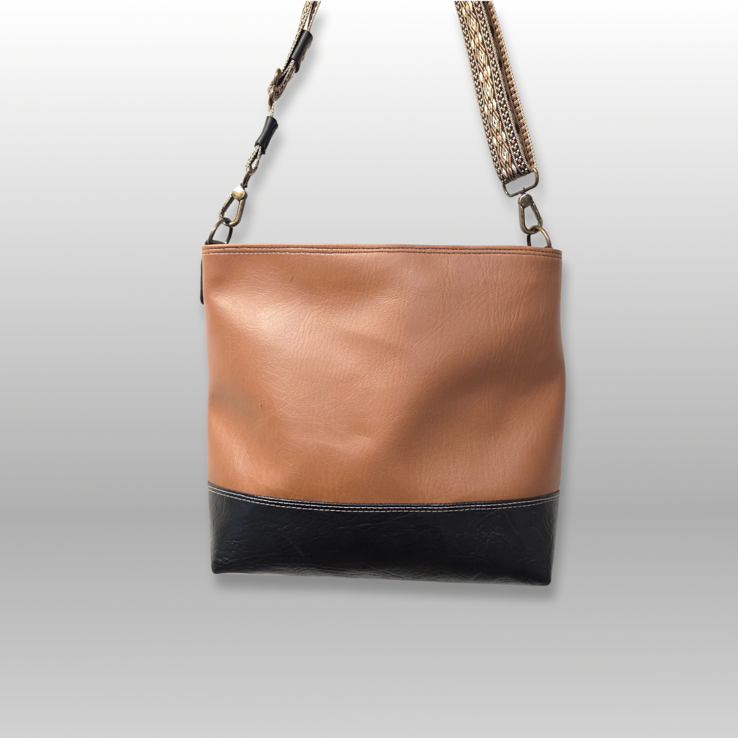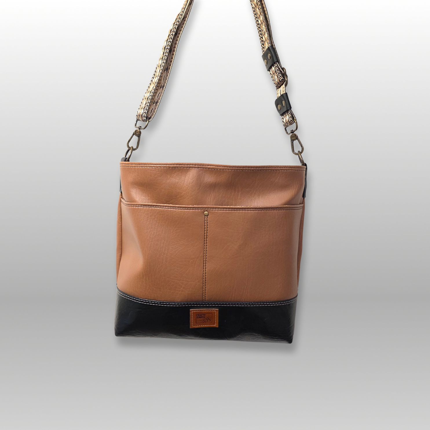 As classic as they come, this medium-large faux leather bag will work as hard as you do. Reinforced black bottom with 2 front slip pockets. Cotton print interior has one zipper pocket and one slip pocket. Generous 1.5" wide jacquard woven strap can be adjusted for shoulder or crossbody carry. Top recessed zipper closure.