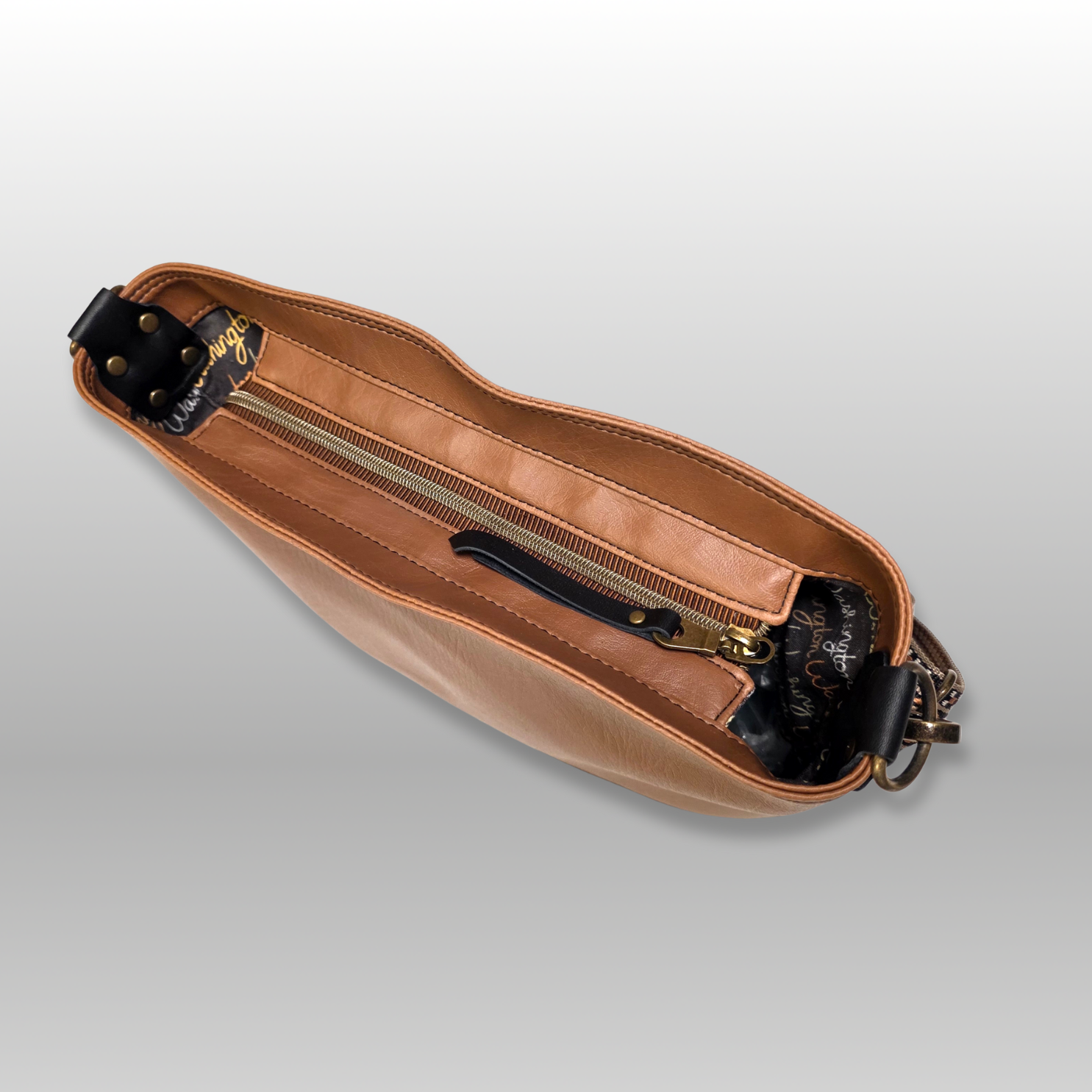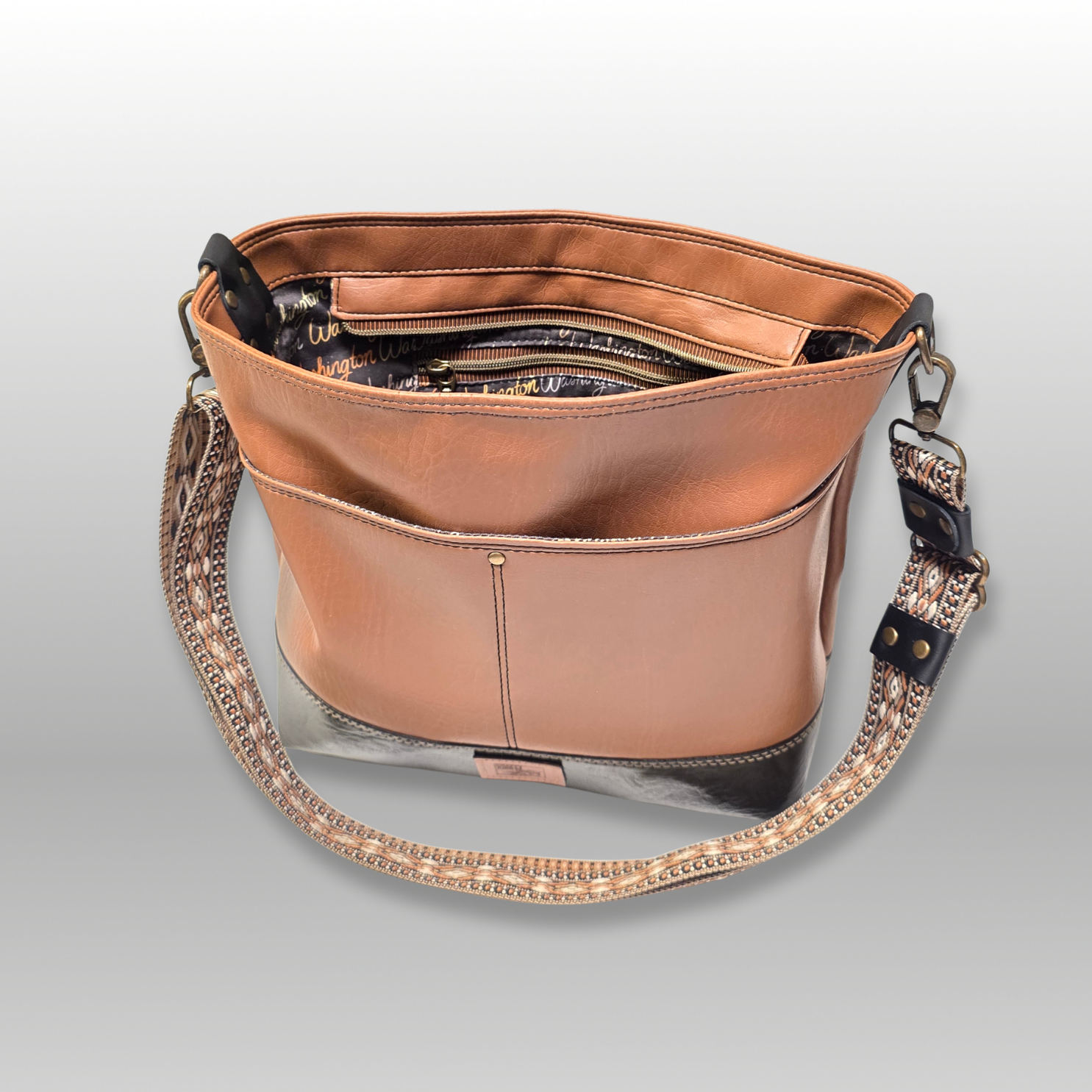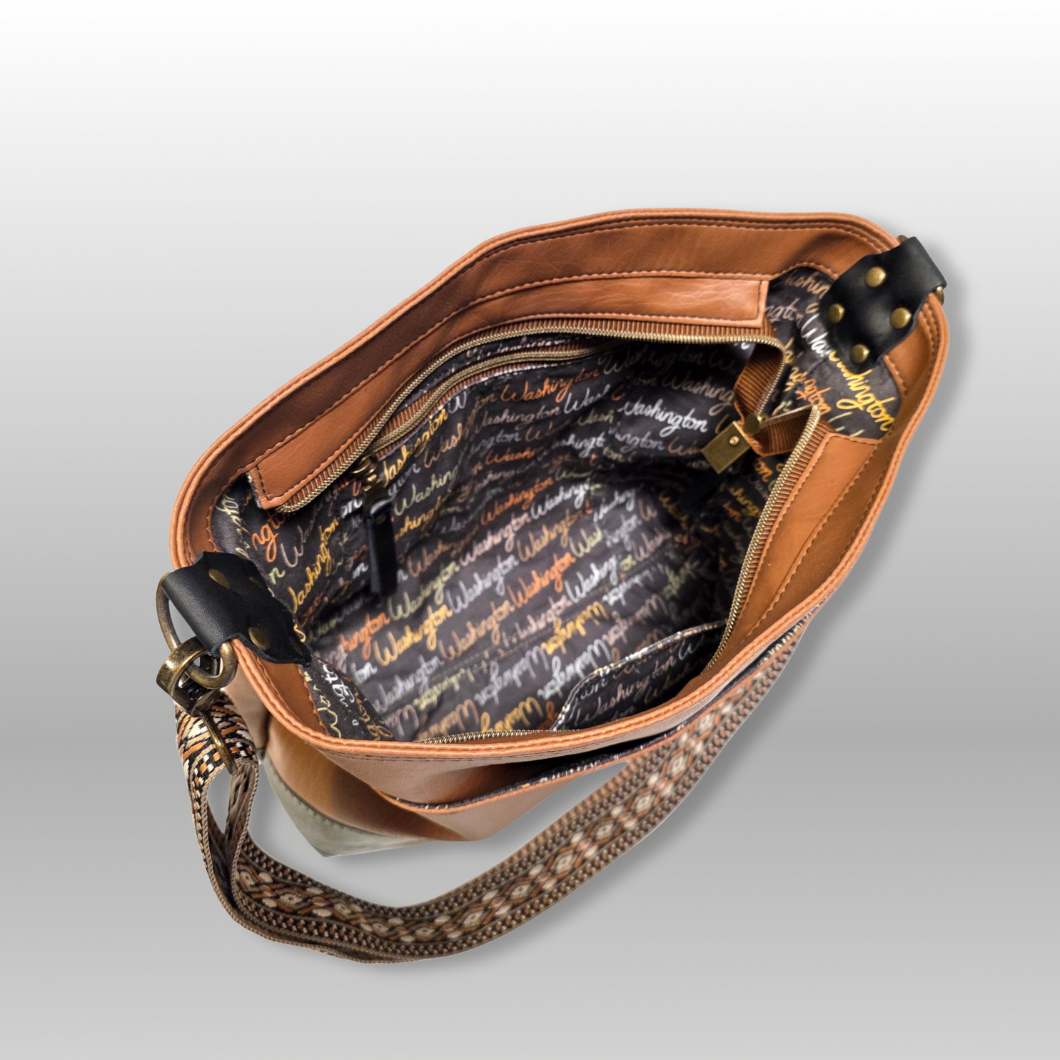 As classic as they come, this medium-large faux leather bag will work as hard as you do. Reinforced black bottom with 2 front slip pockets. Cotton print interior has one zipper pocket and one slip pocket. Generous 1.5" wide jacquard woven strap can be adjusted for shoulder or crossbody carry. Top recessed zipper closure.
