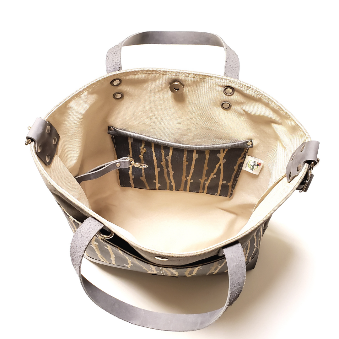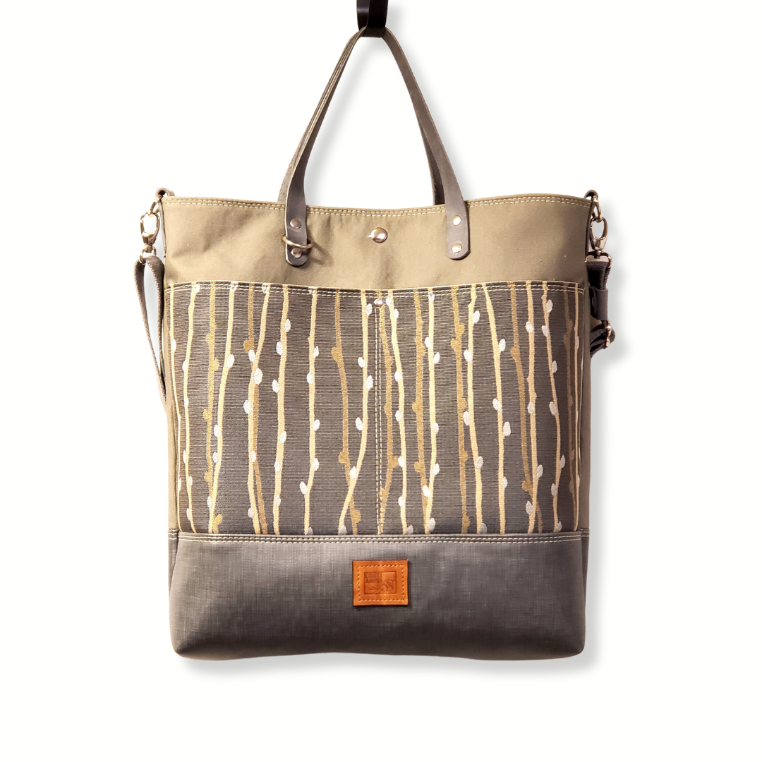 A classic and sophisticated tote featuring faux leather and upholstery fabric. This simple and elegant tote will look great with anything and will keep your must have essentials close at hand. A divided front pocket is perfect for stashing keys and a phone. The inside slip pocket will keep small items from getting lost in the generous waterproof canvas interior. Leather handles, strap connectors and trimmed webbing adjustable crossbody strap. Included interior key tether. Size approx. 13"wide x 15"high x 3"deep